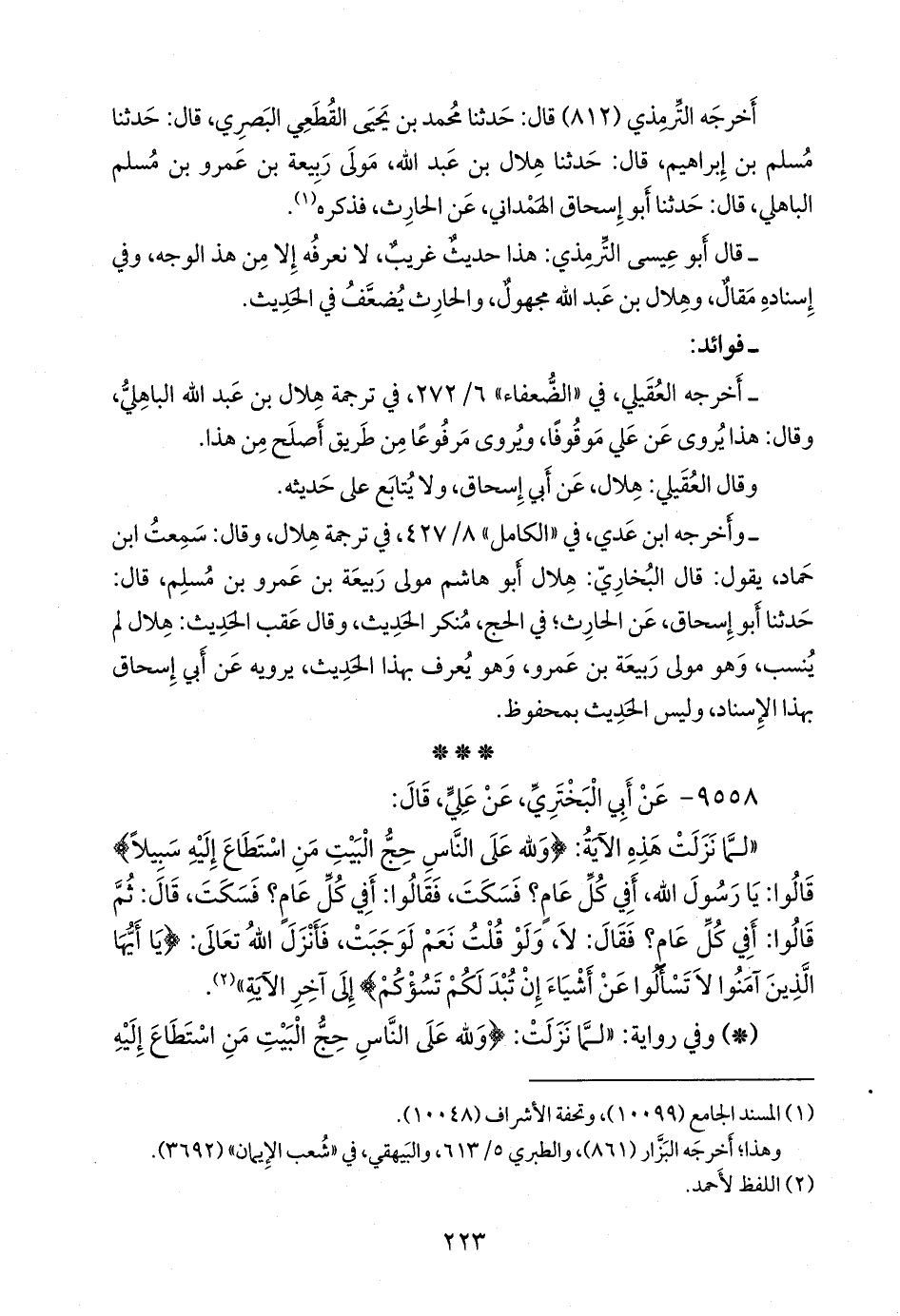 - وأخرجه ابن عَدي في «الكامل» ٨/ ٤٢٧، في مناكير هلال، وقال: سمعت ابن حماد، يقول: قال البخاري: هلال أَبو هاشم مولى ربيعة بن عَمرو بن مسلم، قال: حدثنا أَبو إسحاق، عن الحارث؛ في الحج، منكر الحديث، وقال عقب الحديث: هلال لم ينسب، وهو مولى ربيعة بن عَمرو، وهو يعرف بهذا الحديث، يرويه عن أبي إسحاق بهذا الإسناد، وليس الحديث بمحفوظ.