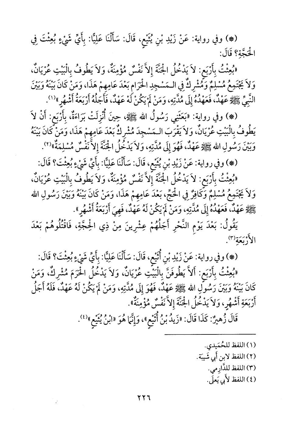 - وفي رواية: «عن زيد بن أثيع، قال: سألنا عليا: بأي شيء بعثت؟ قال: بعثت بأربع: لا يطوفن بالبيت عريان، ولا يدخل الحرم مشرك، ومن كان بينه وبين رسول الله صَلى الله عَليه وسَلم عهد، فهو إلى مدته, ومن لم يكن له عهد، فله أجل أربعة أشهر، ولا يدخل الجنة إلا نفس مؤمنة».