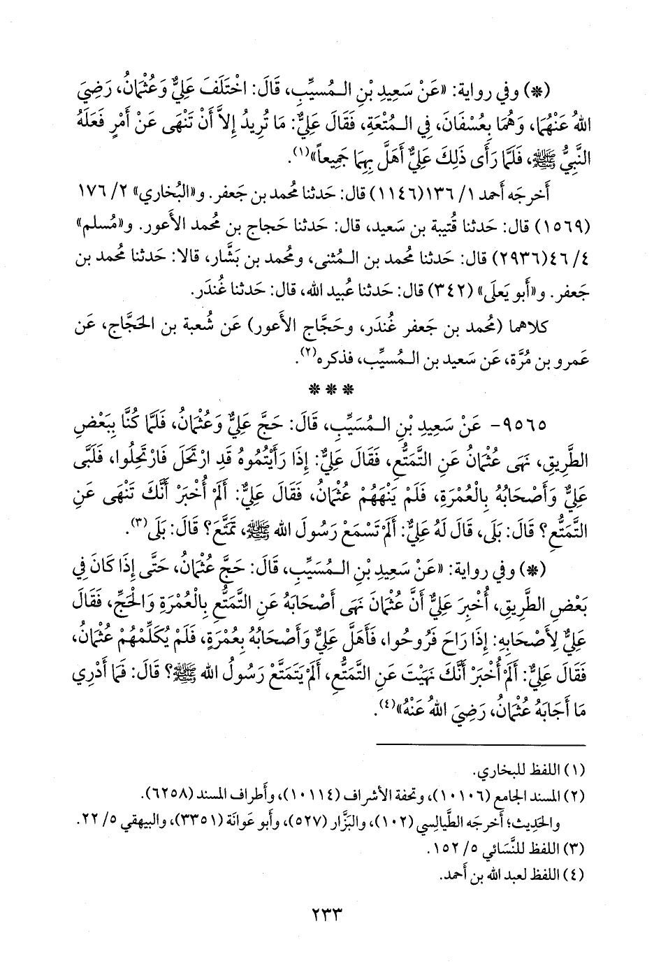 - وفي رواية: «عن سعيد بن المُسَيب، قال: حج عثمان، حتى إذا كان في بعض الطريق، أخبر علي أن عثمان نهى أصحابه عن التمتع بالعمرة والحج، فقال علي لأصحابه: إذا راح فروحوا، فأهل علي وأصحابه بعمرة، فلم يكلمهم عثمان، فقال علي: ألم أخبر أنك نهيت عن التمتع، ألم يتمتع رسول الله صَلى الله عَليه وسَلم؟ قال: فما أدري ما أجابه عثمان، رضي الله عنه» (¬٢).