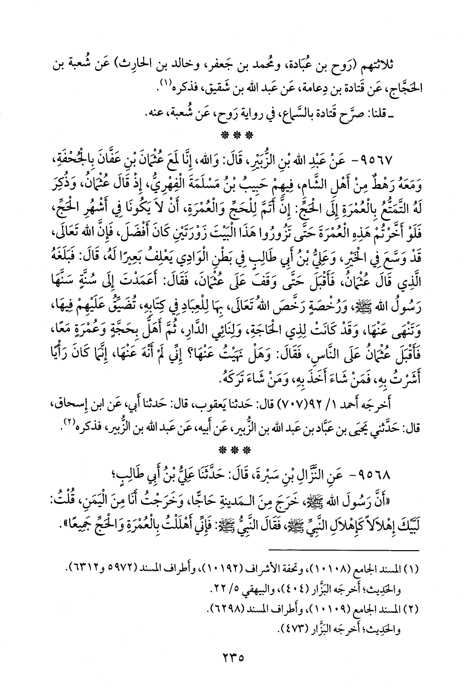 ٩٥٦٧ - عن عبد الله بن الزبير، قال: والله، إنا لمع عثمان بن عفان بالجحفة، ومعه رهط من أهل الشام، فيهم حبيب بن مَسلَمة الفهري، إذ قال عثمان، وذكر له التمتع بالعمرة إلى الحج: إن أتم للحج والعمرة، أن لا يكونا في أشهر الحج، فلو أخرتم هذه العمرة حتى تزوروا هذا البيت زورتين كان أفضل، فإن الله تعالى، قد وسع في الخير، وعلي بن أبي طالب في بطن الوادي يعلف بعيرا له، قال: فبلغه الذي قال عثمان، فأقبل حتى وقف على عثمان، فقال: أعمدت إلى سنة سنها رسول الله صَلى الله عَليه وسَلم ورخصة رخص الله تعالى، بها للعباد في كتابه، تضيق عليهم فيها، وتنهى عنها، وقد كانت لذي الحاجة، ولنائي الدار، ثم أهل بحجة وعمرة معا، فأقبل عثمان على الناس، فقال: وهل نهيت عنها؟ إني لم أنه عنها، إنما كان رأيا أشرت به، فمن شاء أخذ به، ومن شاء تركه.