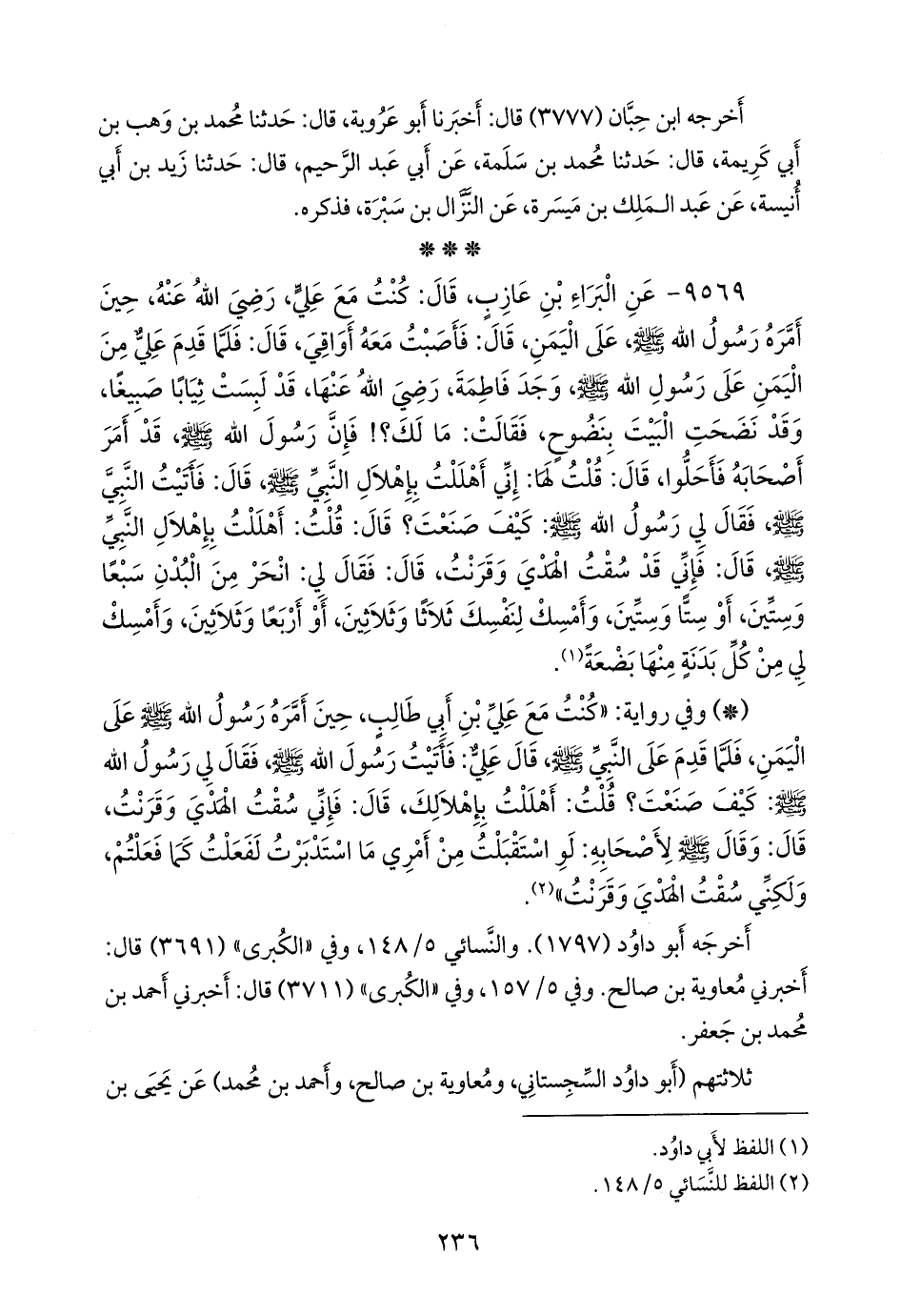 ٩٥٦٩ - عن البراء بن عازب، قال: كنت مع علي, رضي الله عنه, حين أمره رسول الله صَلى الله عَليه وسَلم على اليمن، قال: فأصبت معه أواقي، قال: فلما قدم علي من اليمن على رسول الله صَلى الله عَليه وسَلم وجد فاطمة، رضي الله عنها، قد لبست ثيابا صبيغا، وقد نضحت البيت بنضوح، فقالت: ما لك؟! فإن رسول الله صَلى الله عَليه وسَلم قد أمر أصحابه فأحلوا، قال: قلت لها: إني أهللت بإهلال النبي صَلى الله عَليه وسَلم قال: فأتيت النبي صَلى الله عَليه وسَلم فقال لي رسول الله صَلى الله عَليه وسَلم: كيف صنعت؟ قال: قلت: أهللت بإهلال النبي صَلى الله عَليه وسَلم قال: فإني قد سقت الهدي وقرنت، قال: فقال لي: انحر من البدن سبعا وستين، أو ستا وستين، وأمسك لنفسك ثلاثا وثلاثين، أو أربعا وثلاثين، وأمسك لي من كل بدنة منها بَضعة (¬١).