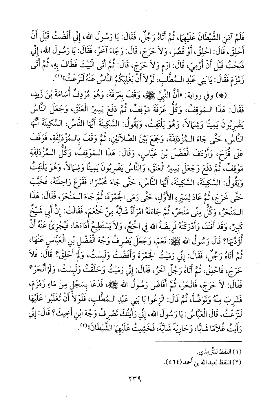 - وفي رواية: «أن النبي صَلى الله عَليه وسَلم وقف بعرفة، وهو مردف أُسامة بن زيد، فقال: هذا الموقف، وكل عرفة موقف، ثم دفع يسير العنق، وجعل الناس يضربون يمينا وشمالا، وهو يلتفت، ويقول: السكينة أيها الناس، السكينة أيها الناس، حتى جاء المزدلفة، وجمع بين الصلاتين، ثم وقف بالمزدلفة، فوقف على قزح، وأردف الفضل بن عباس، وقال: هذا الموقف، وكل المزدلفة موقف، ثم دفع وجعل يسير العنق، والناس يضربون يمينا وشمالا، وهو يلتفت ويقول: السكينة، السكينة، أيها الناس، حتى جاء محسرا، فقرع راحلته، فخبب حتى خرج، ثم عاد لسيره الأول، حتى رمى الجمرة، ثم جاء المنحر، فقال: هذا المنحر، وكل منى منحر، ثم جاءته امرأة شابة من خثعم، فقالت: إن أبي شيخ كبير، وقد أفند، وأدركته فريضة الله في الحج، ولا يستطيع أداءها، فيجزئ عنه أن أؤديها؟ قال رسول الله صَلى الله عَليه وسَلم: نعم، وجعل يصرف وجه الفضل بن العباس عنها، ثم أتاه رجل، فقال: إني رميت الجمرة وأفضت ولبست، ولم أحلق؟ قال: فلا حرج، فاحلق، ثم أتاه رجل آخر، فقال: إني رميت وحلقت ولبست، ولم أنحر؟ فقال: لا حرج، فانحر، ثم أفاض رسول الله صَلى الله عَليه وسَلم فدعا بسجل من ماء زمزم، فشرب منه وتوضأ، ثم قال: انزعوا يا بني عبد المطلب، فلولا أن تغلبوا عليها لنزعت، قال العباس: يا رسول الله، إني رأيتك تصرف وجه ابن أخيك؟ قال: إني رأيت غلاما شابا، وجارية شابة، فخشيت عليهما الشيطان» (¬١).