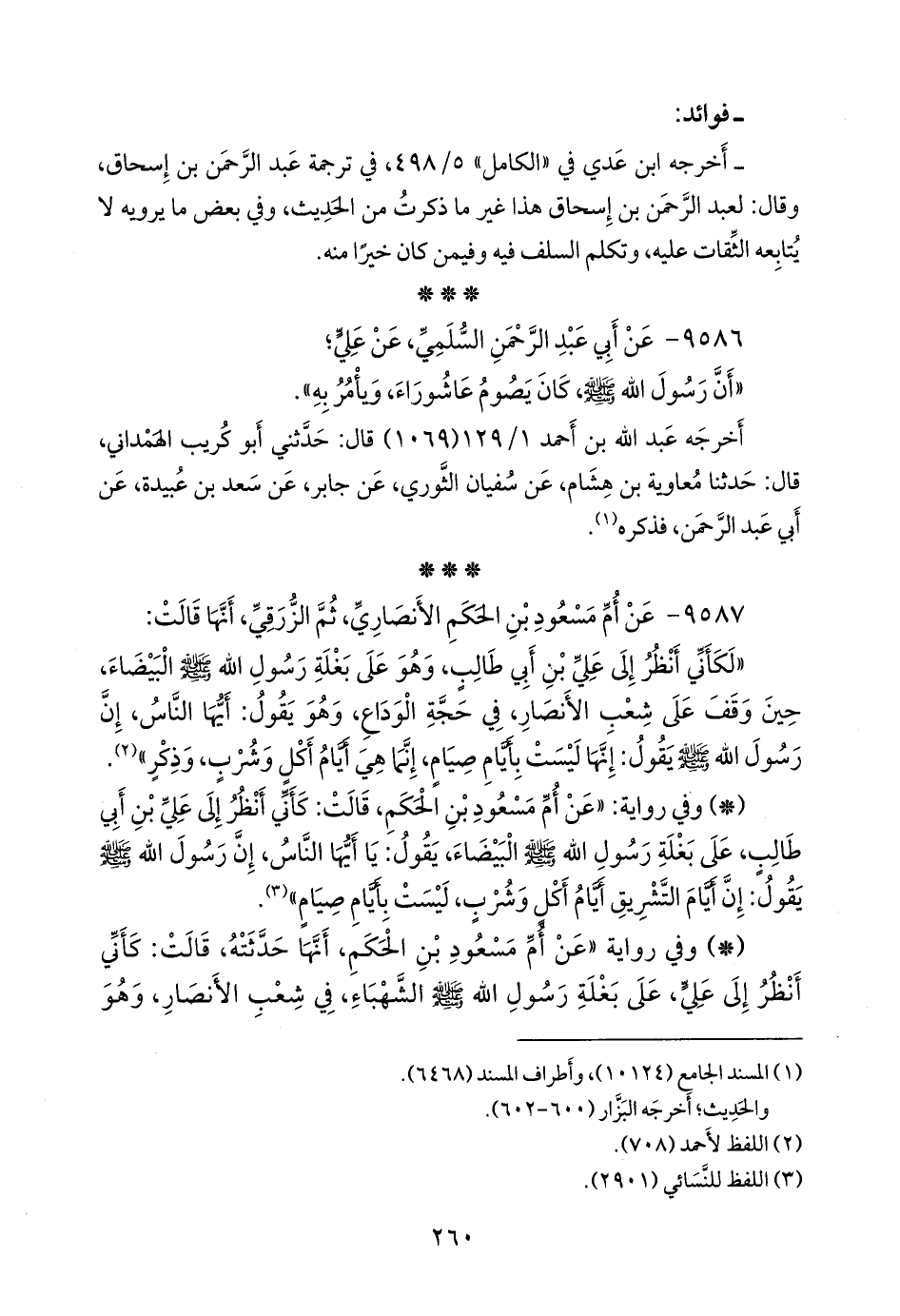- وفي رواية: «عن أم مسعود بن الحكم, أنها حدثته، قالت: كأني أنظر إلى علي، على بغلة رسول الله صَلى الله عَليه وسَلم الشهباء، في شعب الأنصار، وهو