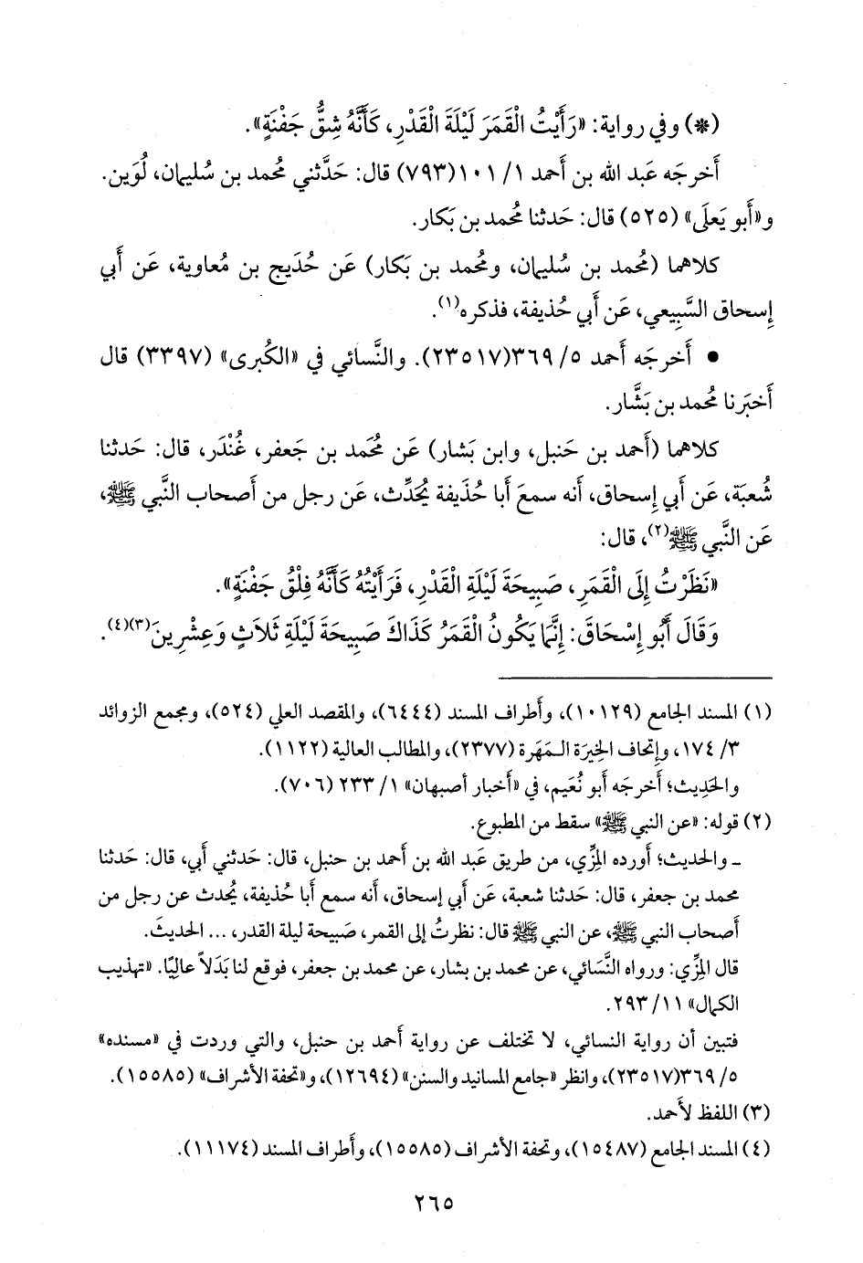 - والحديث؛ أورده المزي، من طريق عبد الله بن أحمد بن حنبل، قال: حدثني أبي، قال: حدثنا محمد بن جعفر، قال: حدثنا شعبة، عن أبي إسحاق، أنه سمع أبا حذيفة، يحدث عن رجل من أصحاب النبي صَلى الله عَليه وسَلم عن النبي صَلى الله عَليه وسَلم قال: نظرت إلى القمر، صبيحة ليلة القدر، الحديث.