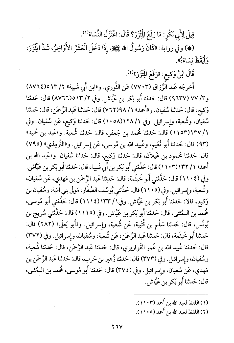 وفي ١/ ١٣٧ (١١٥٣) قال: حدثنا محمد بن جعفر، قال: حدثنا شعبة. و «عَبد بن حُميد» (٩٣) قال: حدثنا أَبو نُعيم، وعُبيد الله بن موسى، عن إسرائيل. و «التِّرمِذي» (٧٩٥) قال: حدثنا محمود بن غَيلان، قال: حدثنا وكيع، قال: حدثنا سفيان. و «عبد الله بن أحمد» ١/ ١٣٢ (١١٠٣) قال: حدثني أَبو بكر بن أبي شيبة، قال: حدثنا أَبو بكر بن عياش. وفي (١١٠٤) قال: حدثني أَبو خيثمة، قال: حدثنا عبد الرَّحمَن بن مهدي، عن سفيان، وشعبة، وإسرائيل. وفي (١١٠٥) قال: حدثني يوسف الصفار مولى بني أمية، وسفيان بن وكيع، قالا: حدثنا أَبو بكر بن عياش. وفي ١/ ١٣٣ (١١١٤) قال: حدثني أَبو موسى، محمد بن المثنى، قال: حدثنا أَبو بكر بن عياش. وفي (١١١٥) قال: حدثني سريج بن يونس، قال: حدثنا سلم بن قتيبة، عن شعبة، وإسرائيل. و «أَبو يَعلى» (٢٨٢) قال: حدثنا أَبو خيثمة، قال: حدثنا عبد الرَّحمَن، عن شعبة، وسفيان، وإسرائيل. وفي (٣٧٢) قال: حدثنا عُبيد الله بن عمر القواريري، قال: حدثنا عبد الرَّحمَن، قال: حدثنا شعبة، وسفيان، وإسرائيل. وفي (٣٧٣) قال: حدثنا زهير بن حرب، قال: حدثنا عبد الرَّحمَن بن مهدي، عن سفيان، وإسرائيل. وفي (٣٧٤) قال: حدثنا أَبو موسى، محمد بن المثنى، قال: حدثنا أَبو بكر بن عياش.