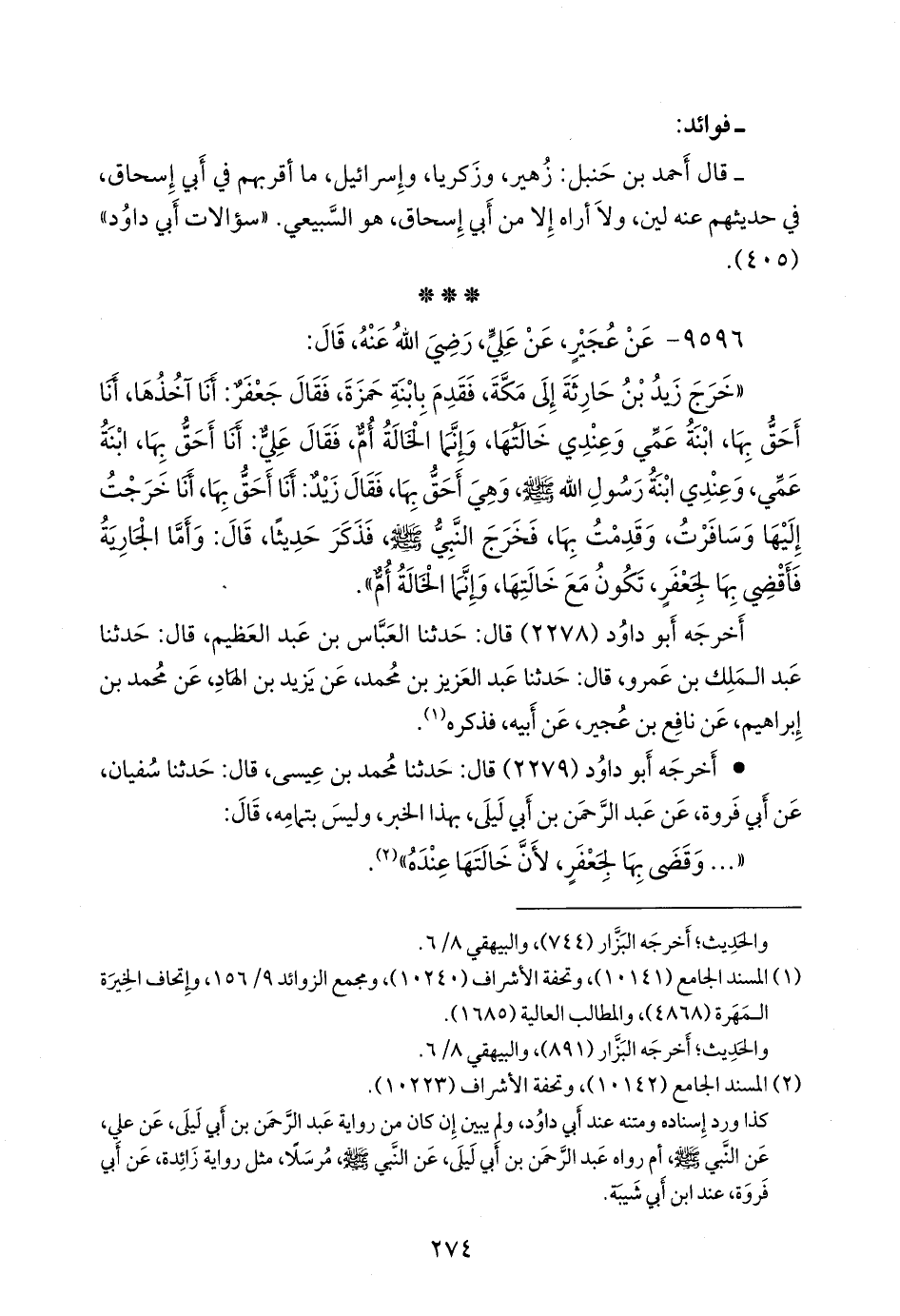 «خرج زيد بن حارثة إلى مكة، فقدم بابنة حمزة، فقال جعفر: أنا آخذها، أنا أحق بها، ابنة عمي وعندي خالتها، وإنما الخالة أم، فقال علي: أنا أحق بها، ابنة عمي، وعندي ابنة رسول الله صَلى الله عَليه وسَلم وهي أحق بها، فقال زيد: أنا أحق بها، أنا خرجت إليها وسافرت، وقدمت بها، فخرج النبي صَلى الله عَليه وسَلم فذكر حديثا، قال: وأما الجارية فأقضي بها لجعفر، تكون مع خالتها، وإنما الخالة أم».