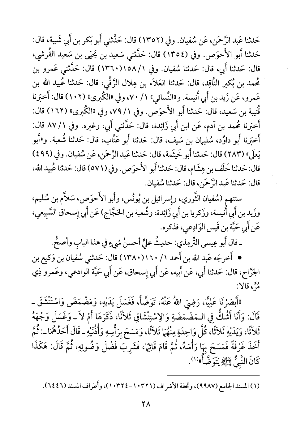 و «النَّسَائي» ١/ ٧٠، وفي «الكبرى» (١٠٢) قال: أخبرنا قتيبة بن سعيد، قال: حدثنا أَبو الأحوص. وفي ١/ ٧٩، وفي «الكبرى» (١٦٢) قال: أخبرنا محمد بن آدم، عن ابن أبي زائدة، قال: حدثني أبي، وغيره. وفي ١/ ٨٧ قال: أخبرنا أَبو داود سليمان بن سيف، قال: حدثنا أَبو عتاب، قال: حدثنا شعبة. و «أَبو يَعلى» (٢٨٣) قال: حدثنا أَبو خيثمة، قال: حدثنا عبد الرَّحمَن، عن سفيان. وفي (٤٩٩) قال: حدثنا خلف بن هشام، قال: حدثنا أَبو الأحوص. وفي (٥٧١) قال: حدثنا عُبيد الله، قال: حدثنا عبد الرَّحمَن، قال: حدثنا سفيان.