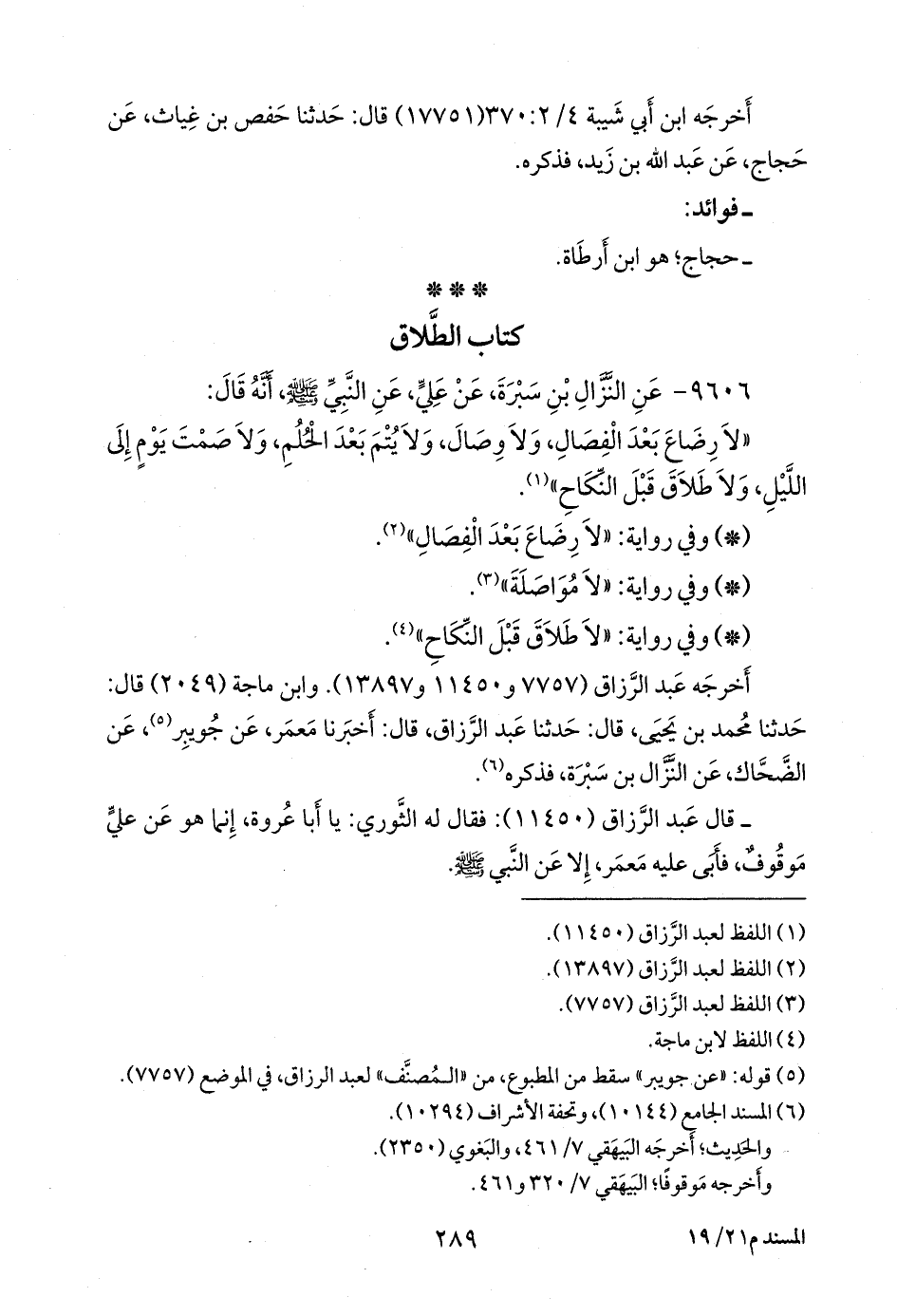 • أخرجه عبد الرزاق (١١٤٥١ و ١٣٨٩٨) عن الثوري، عن جويبر، عن الضحاك بن مزاحم، عن النزال بن سبرة، عن علي، قال: لا رضاع بعد الفصال، ولا يتم بعد الحلم، ولا صمت يوم إلى الليل، ولا طلاق قبل النكاح.