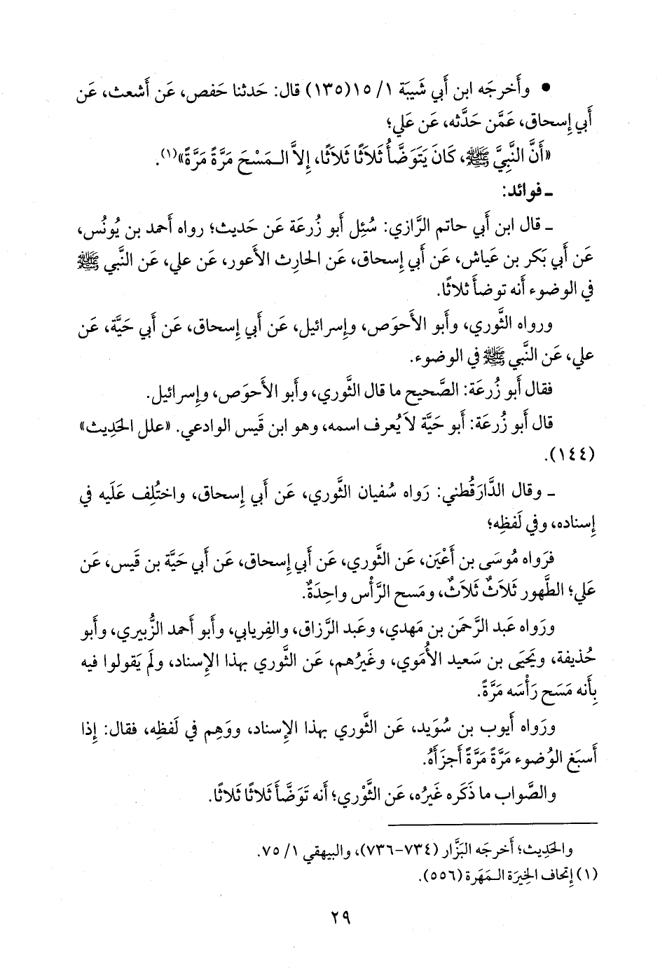 - قلنا: إِسناده ضعيفٌ؛ قال ابن أبي حاتم الرازي: سئل أَبو زُرعَة عن حديث؛ رواه أحمد بن يونس، عن أَبي بكر بن عياش، عن أبي إسحاق، عن الحارث الأعور، عن علي، عن النبي صَلى الله عَليه وسَلم في الوضوء أنه توضأ ثلاثا.