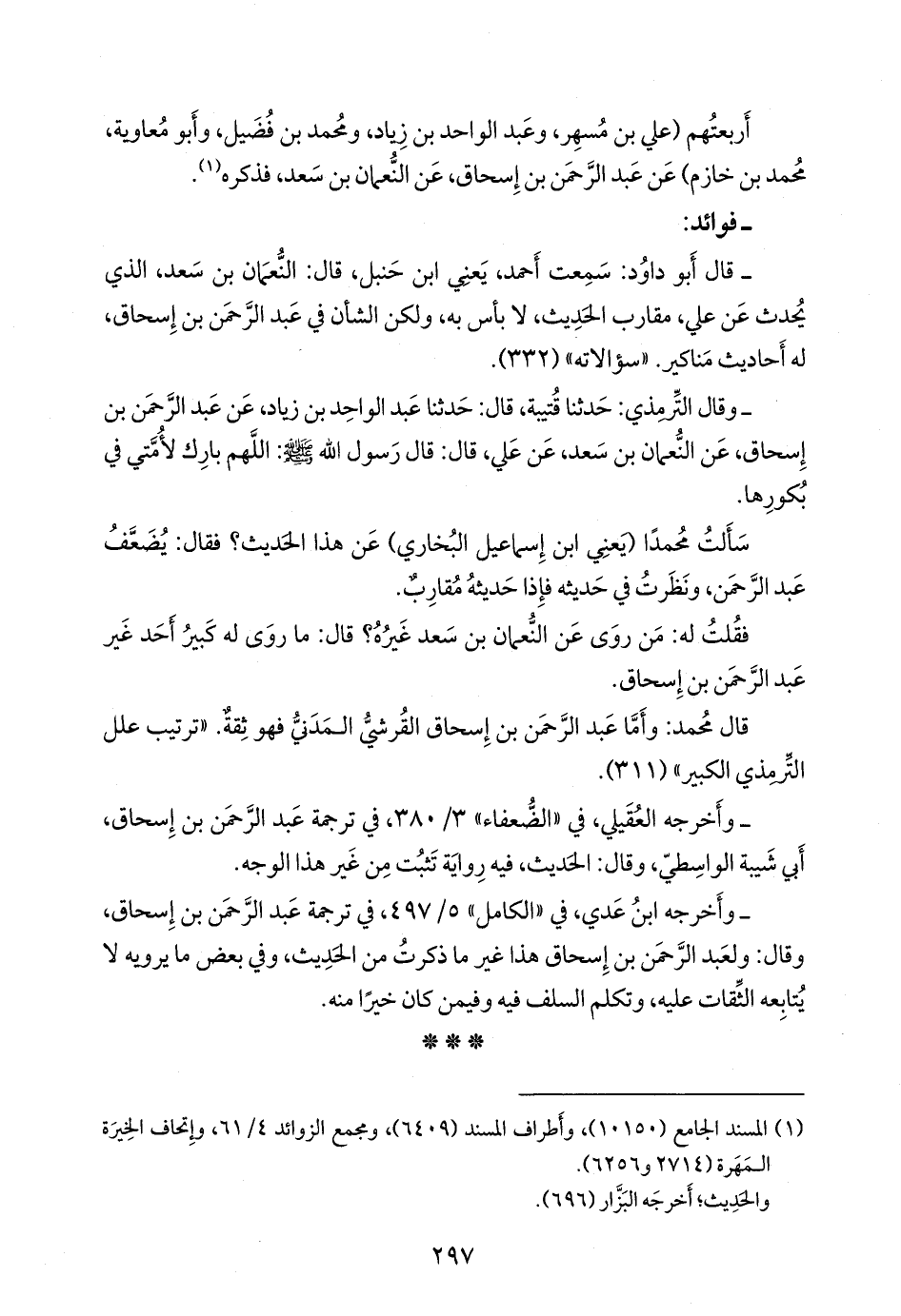 - قال أَبو داود: سمعت أحمد، يعني ابن حنبل، قال: النعمان بن سعد، الذي يحدث عن علي، مقارب الحديث، لا بأس به، ولكن الشأن في عبد الرَّحمَن بن إسحاق، له أحاديث مناكير. «سؤالاته» (٣٣٢).