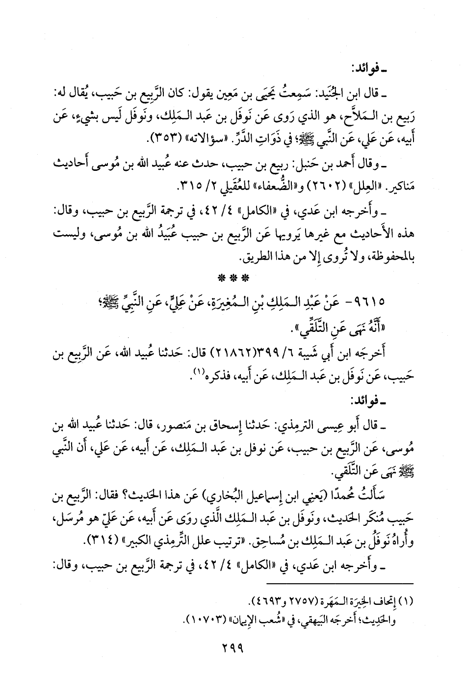 سألتُ محمدًا، يعني ابن إسماعيل البخاري، عن هذا الحديث؟ فقال: الربيع بن حبيب منكر الحديث، ونوفل بن عبد الملك الذي روى عن أبيه، عن علي هو مرسل، وأراه نوفل بن عبد الملك بن مساحق. «ترتيب علل التِّرمِذي الكبير» (٣١٤).