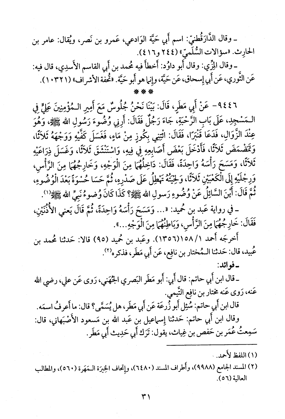 ٩٤٤٦ - عن أبي مطر، قال: بينا نحن جلوس مع أمير المؤمنين علي في المسجد، على باب الرحبة، جاء رجل فقال: أرني وضوء رسول الله صَلى الله عَليه وسَلم وهو عند الزوال، فدعا قنبرا، فقال: ائتني بكوز من ماء، فغسل كفيه ووجهه ثلاثا، وتمضمض ثلاثا، فأدخل بعض أصابعه في فيه، واستنشق ثلاثا، وغسل ذراعيه ثلاثا، ومسح رأسه واحدة، فقال: داخلهما من الوجه، وخارجهما من الرأس، ورجليه إلى الكعبين ثلاثا، ولحيته تهطل على صدره، ثم حسا حسوة بعد الوضوء، ثم قال: أين السائل عن وضوء رسول الله صَلى الله عَليه وسَلم؟ كذا كان وضوء نبي الله صَلى الله عَليه وسَلم (¬١).