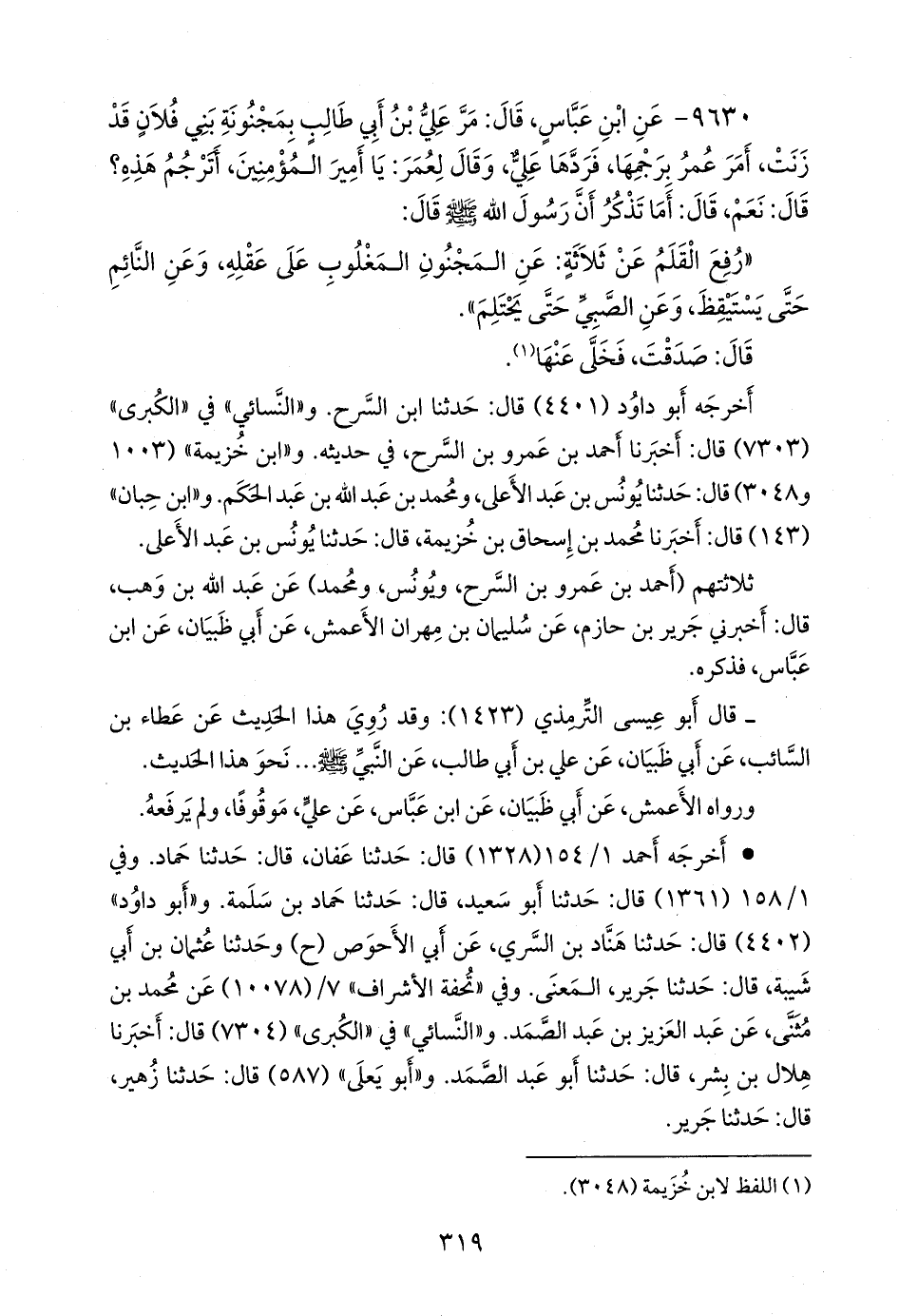 ٩٦٣٠ - عن عبد الله بن عباس، قال: مر علي بن أبي طالب بمجنونة بني فلان قد زنت، أمر عمر برجمها، فردها علي، وقال لعمر: يا أمير المؤمنين، أترجم هذه؟ قال: نعم، قال: أما تذكر أن رسول الله صَلى الله عَليه وسَلم قال: