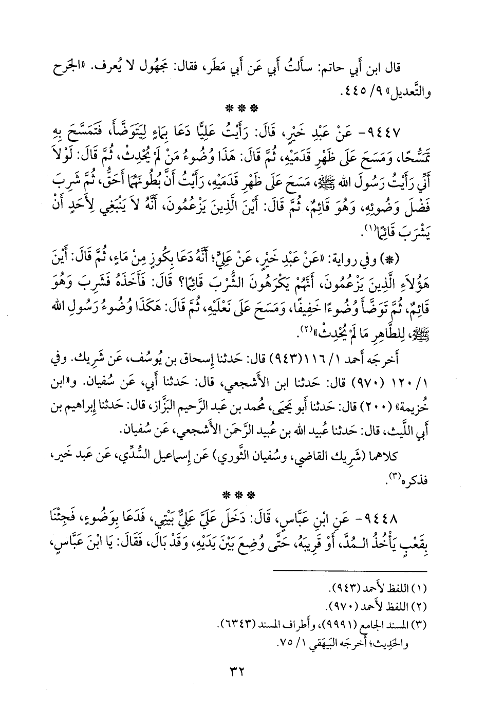 ٩٤٤٧ - عن عبد خير، قال: رأيت عليا دعا بماء ليتوضأ، فتمسح به تمسحا، ومسح على ظهر قدميه، ثم قال: هذا وضوء من لم يحدث، ثم قال: لولا أني رأيت رسول الله صَلى الله عَليه وسَلم مسح على ظهر قدميه، رأيت أن بطونهما أحق، ثم شرب فضل وضوئه، وهو قائم، ثم قال: أين الذين يزعمون، أنه لا ينبغي لأحد أن يشرب قائمًا (¬١).