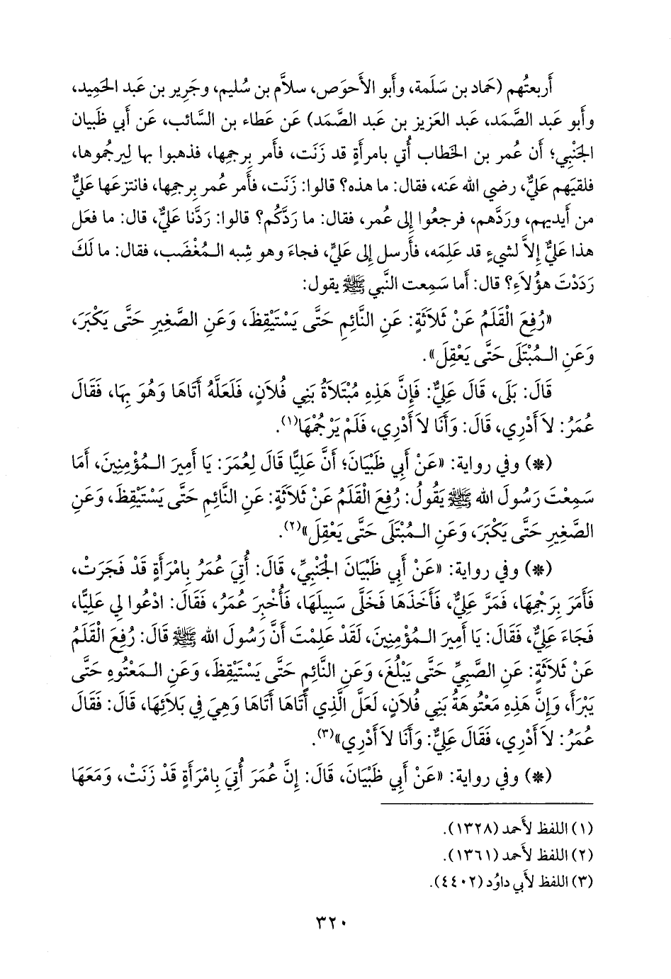 أربعتهم (حماد بن سلمة، وأَبو الأحوص سَلَّام بن سليم، وجرير بن عبد الحميد، وأَبو عبد الصمد عبد العزيز بن عبد الصمد) عن عطاء بن السائب، عن أبي ظبيان الجنبي؛ أن عمر بن الخطاب أتي بامرأة قد زنت، فأمر برجمها، فذهبوا بها ليرجموها، فلقيهم علي، رضي الله عنه، فقال: ما هذه؟ قالوا: زنت، فأمر عمر برجمها، فانتزعها علي من أيديهم، وردهم، فرجعوا إلى عمر، فقال: ما ردكم؟ قالوا: ردنا علي، قال: ما فعل هذا علي إلا لشيء قد علمه، فأرسل إلى علي، فجاء وهو شبه المغضب، فقال: ما لك رددت هؤلاء؟ قال: أما سمعت النبي صَلى الله عَليه وسَلم يقول: