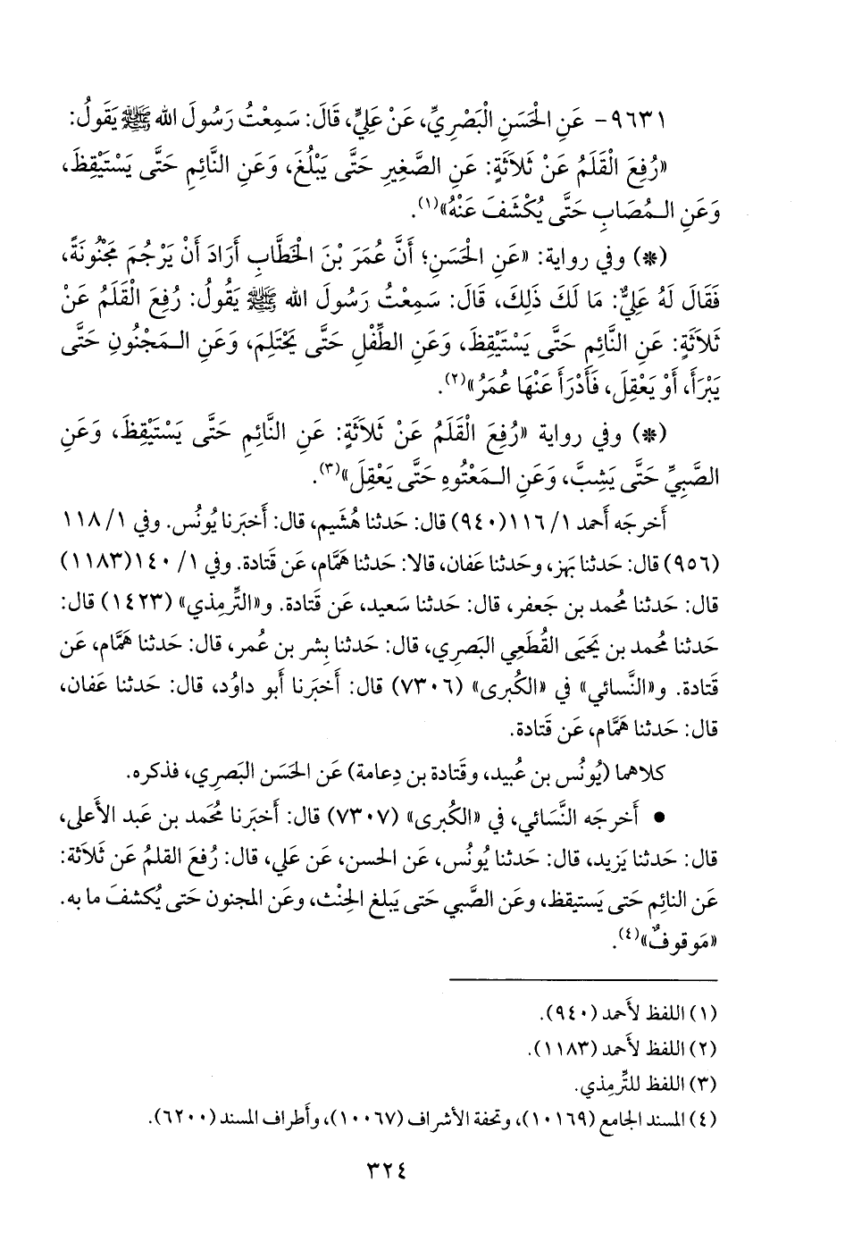 • أَخرجه النَّسَائي في «الكبرى» (٧٣٠٧) قال: أَخبرنا محمد بن عبد الأَعلى، قال: حدثنا يزيد، قال: حدثنا يونس، عن الحسن، عن علي، قال: رفع القلم عن ثلاثة: عن النائم حتى يستيقظ، وعن الصبي حتى يبلغ الحنث, وعن المجنون حتى يكشف ما به. «موقوف» (¬٣).