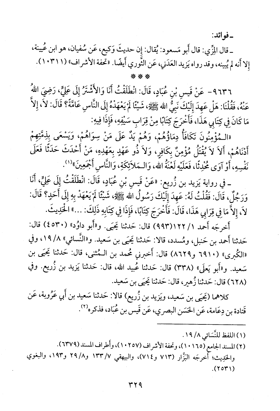 ٩٦٣٦ - عن قيس بن عُبَاد، قال: انطلقت أنا والأشتر إلى علي، رضي الله عنه، فقلنا: هل عهد إليك نبي الله صَلى الله عَليه وسَلم شيئًا لم يعهده إلى الناس عامة؟ قال: لا، إلا ما كان في كتابي هذا، فأخرج كتابا من قراب سيفه، فإذا فيه: