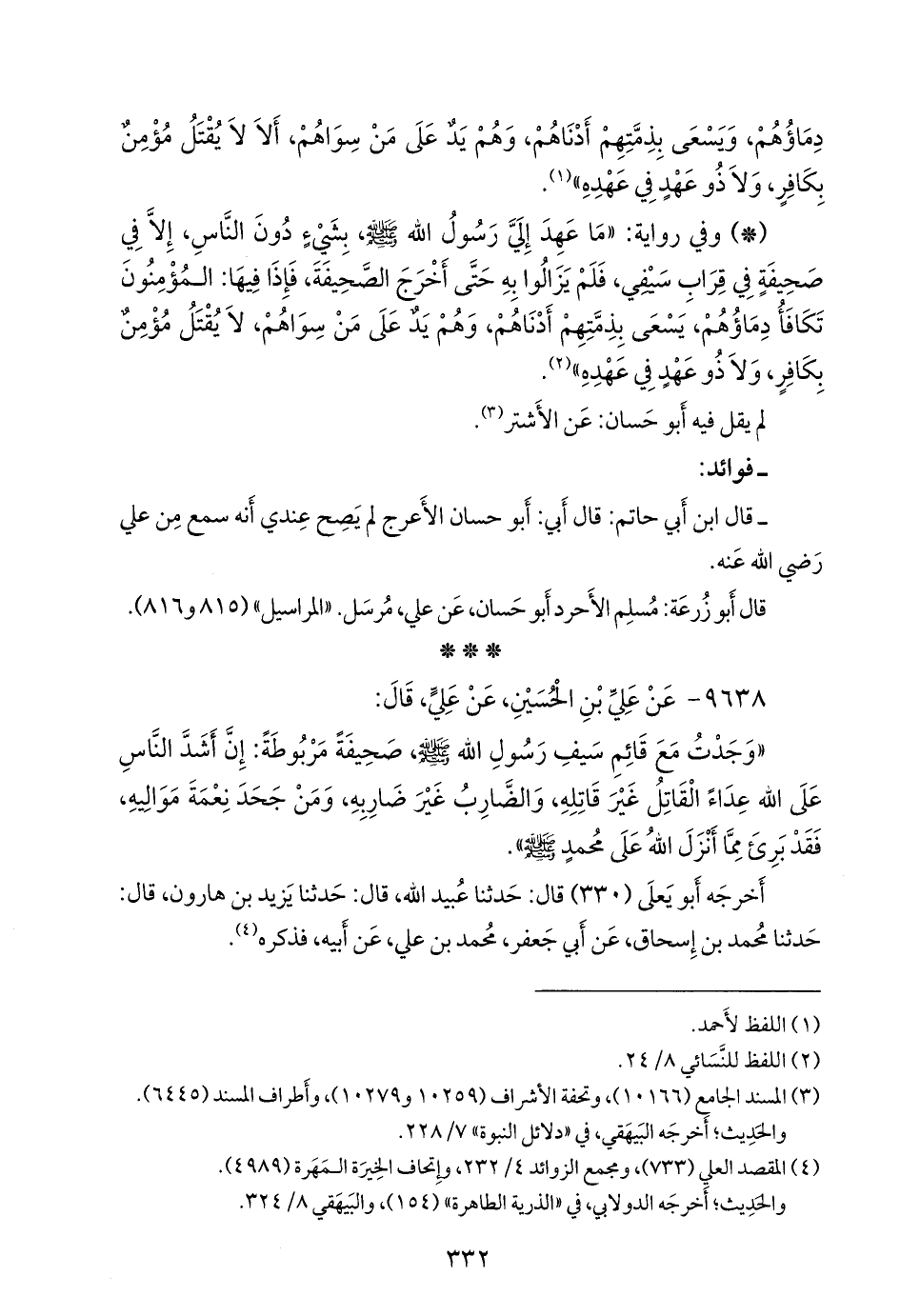 «وجدت مع قائم سيف رسول الله صَلى الله عَليه وسَلم صحيفة مربوطة: إن أشد الناس على الله عداء القاتل غير قاتله، والضارب غير ضاربه، ومن جحد نعمة مواليه، فقد برئ مما أنزل الله على محمد صَلى الله عَليه وسَلم».