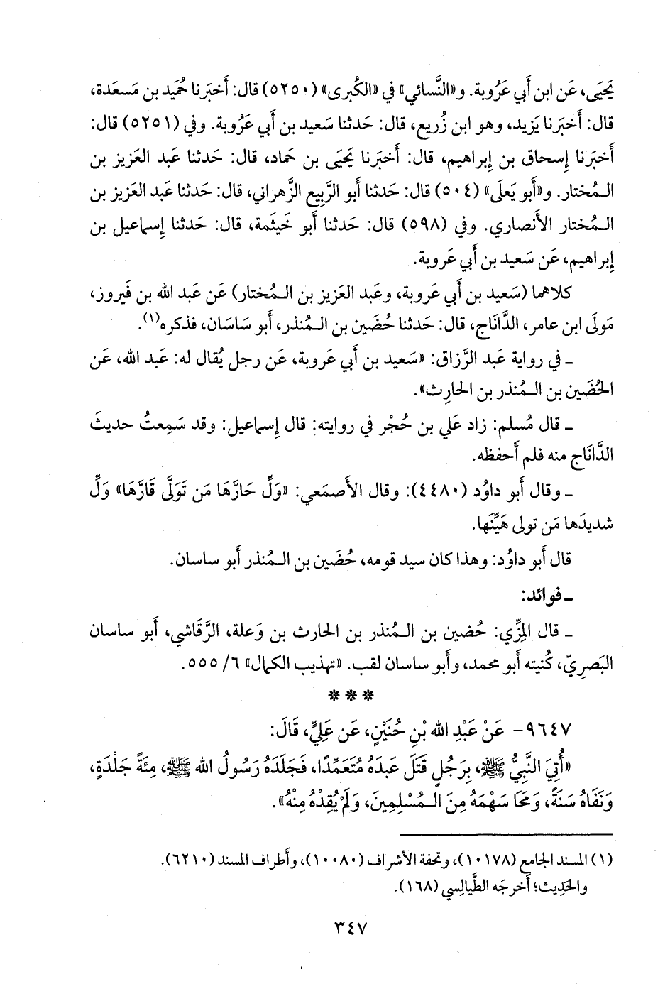 و «النَّسَائي» في «الكبرى» (٥٢٥٠) قال: أخبرنا حميد بن مَسعَدة، قال: أخبرنا يزيد، وهو ابن زُريع، قال: حدثنا سعيد بن أبي عَروبَة. وفي (٥٢٥١) قال: أخبرنا إسحاق بن إبراهيم، قال: أخبرنا يحيى بن حماد، قال: حدثنا عبد العزيز بن المختار. و «أَبو يَعلى» (٥٠٤) قال: حدثنا أَبو الربيع الزهراني، قال: حدثنا عبد العزيز بن المختار الأَنصاري. وفي (٥٩٨) قال: حدثنا أَبو خيثمة، قال: حدثنا إسماعيل بن إبراهيم، عن سعيد بن أبي عَروبَة.