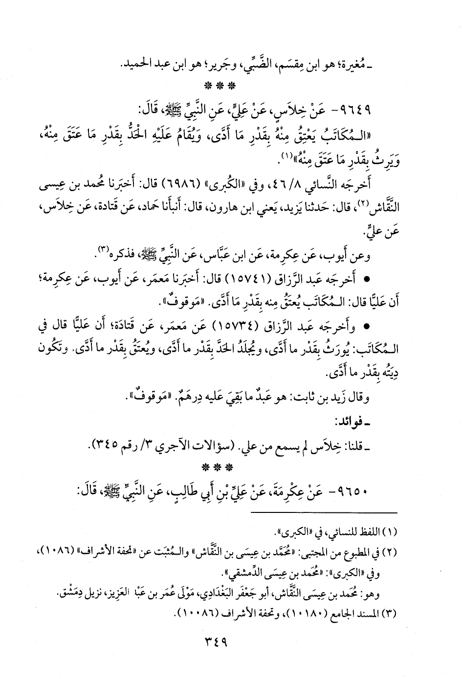 • وأخرجه النَّسَائي في «الكبرى» (٥٠٠٦) قال: أخبرنا حميد بن مَسعَدة، قال: حدثنا سفيان، عن خالد، عن عكرمة، عن علي، قال: إذا أدى النصف فهو غريم.