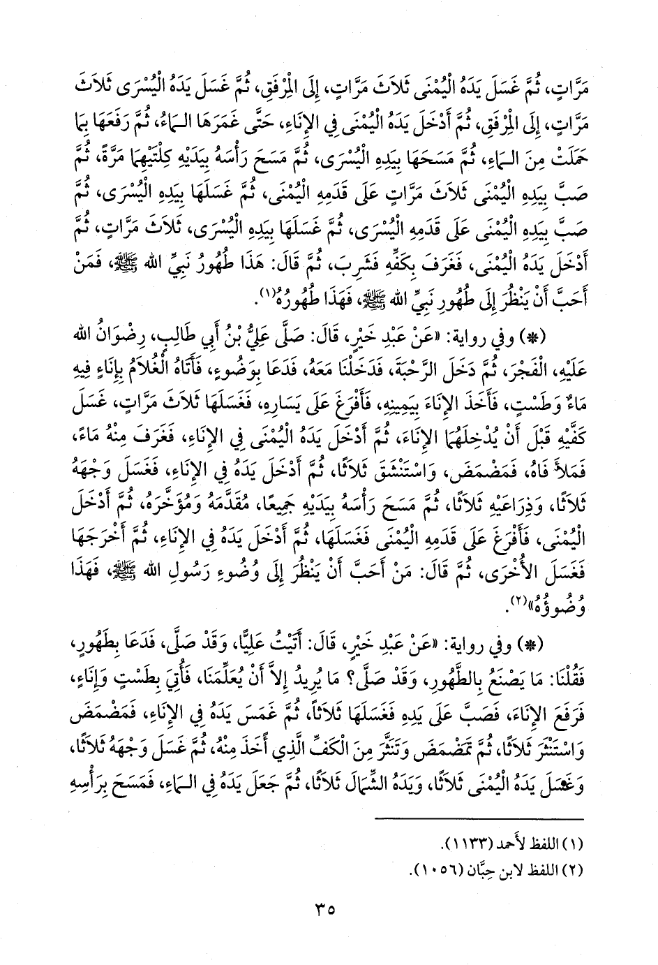 - وفي رواية: «عن عبد خير، قال: صلى علي بن أبي طالب، رضوان الله عليه، الفجر، ثم دخل الرحبة، فدخلنا معه، فدعا بوضوء، فأتاه الغلام بإناء فيه ماء وطست، فأخذ الإناء بيمينه، فأفرغ على يساره، فغسلها ثلاث مرات، غسل كفيه قبل أن يدخلهما الإناء، ثم أدخل يده اليمنى في الإناء، فغرف منه ماء، فملأ فاه، فمضمض، واستنشق ثلاثا، ثم أدخل يده في الإناء، فغسل وجهه ثلاثا، وذراعيه ثلاثا، ثم مسح رأسه بيديه جميعا، مقدمه ومؤخره، ثم أدخل اليمنى، فأفرغ على قدمه اليمنى فغسلها، ثم أدخل يده في الإناء، ثم أخرجها فغسل الأخرى، ثم قال: من أحب أن ينظر إلى وضوء رسول الله صَلى الله عَليه وسَلم فهذا وضوؤه» (¬١).