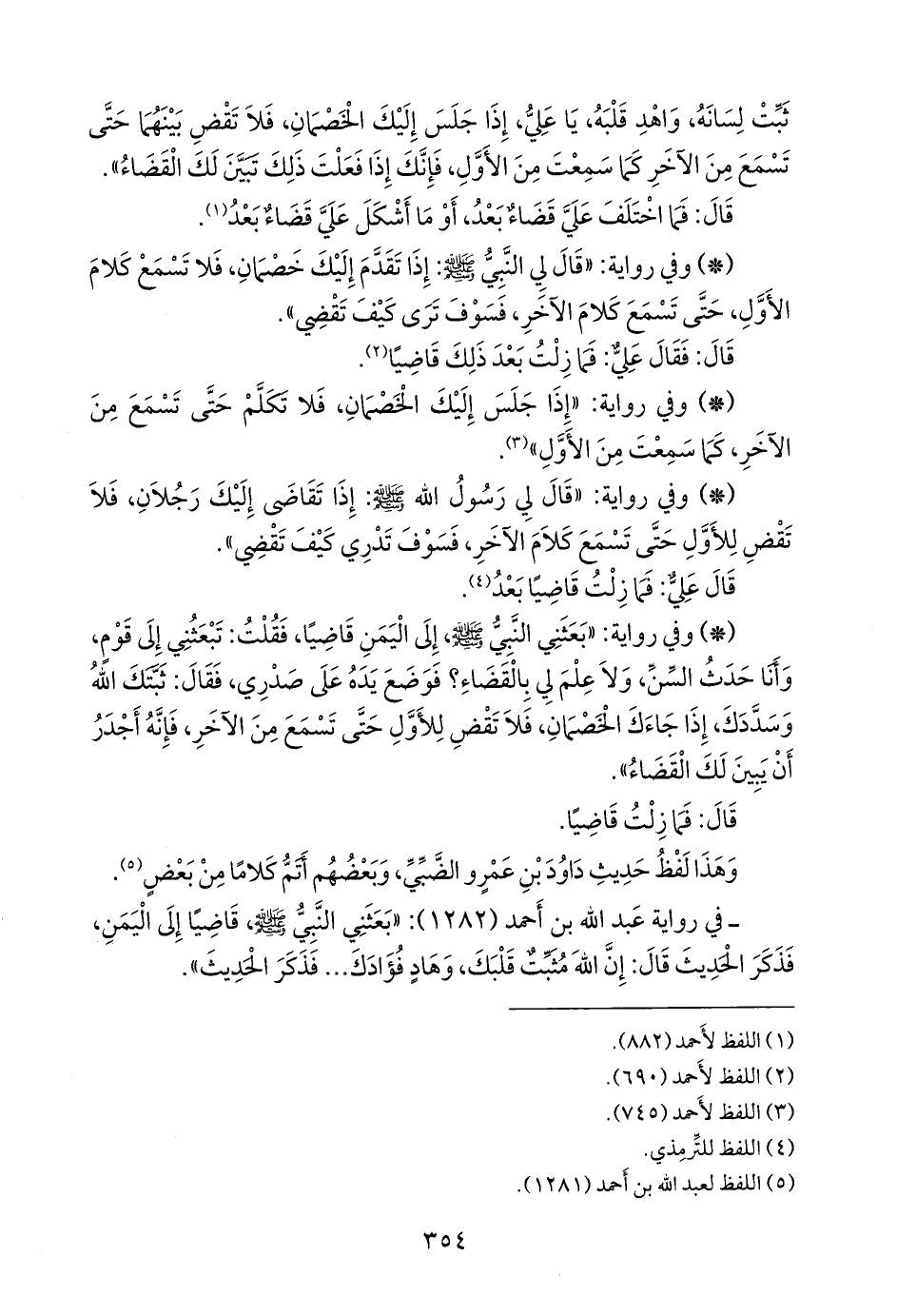 - وفي رواية: «قال لي رسول الله صَلى الله عَليه وسَلم: إذا تقاضى إليك رجلان، فلا تقض للأول حتى تسمع كلام الآخر، فسوف تدري كيف تقضي».
