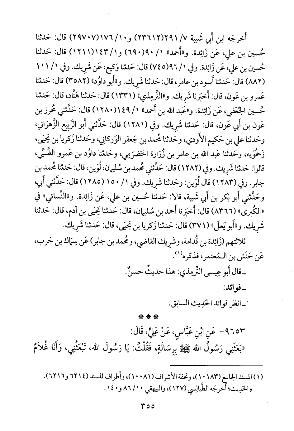 وفي ١/ ١١١ (٨٨٢) قال: حدثنا أسود بن عامر، قال: حدثنا شَريك. و «أَبو داود» (٣٥٨٢) قال: حدثنا عَمرو بن عون، قال: أخبرنا شريك. و «التِّرمِذي» (١٣٣١) قال: حدثنا هَنَّاد، قال: حدثنا حسين الجعفي، عن زائدة. و «عبد الله بن أحمد» ١/ ١٤٩ (١٢٨٠) قال: حدثني مُحرِز بن عون بن أبي عون، قال: حدثنا شَريك. وفي (١٢٨١) قال: حدثني أَبو الربيع الزهراني، وحدثنا علي بن حكيم الأَوْدي، وحدثنا محمد بن جعفر الوركاني، وحدثنا زكريا بن يحيى، زحَمُّويَهْ، وحدثنا عبد الله بن عامر بن زُرارة الحضرمي، وحدثنا داود بن عَمرو الضبي، قالوا: حدثنا شَريك. وفي (١٢٨٢) قال: حدثني محمد بن سليمان لُوَين، قال: حدثنا محمد بن جابر. وفي (١٢٨٣) قال لوين: وحدثنا شَريك. وفي ١/ ١٥٠ (١٢٨٥) قال: حدثني أبي، وحدثني أَبو بكر بن أبي شيبة، قالا: حدثنا حسين بن علي، عن زائدة. و «النَّسَائي» في «الكبرى» (٨٣٦٦) قال: أخبرنا أحمد بن سليمان، قال: حدثنا يحيى بن آدم، قال: حدثنا شَريك. و «أَبو يَعلى» (٣٧١) قال: حدثنا زكريا بن يحيى، قال: حدثنا شَريك.