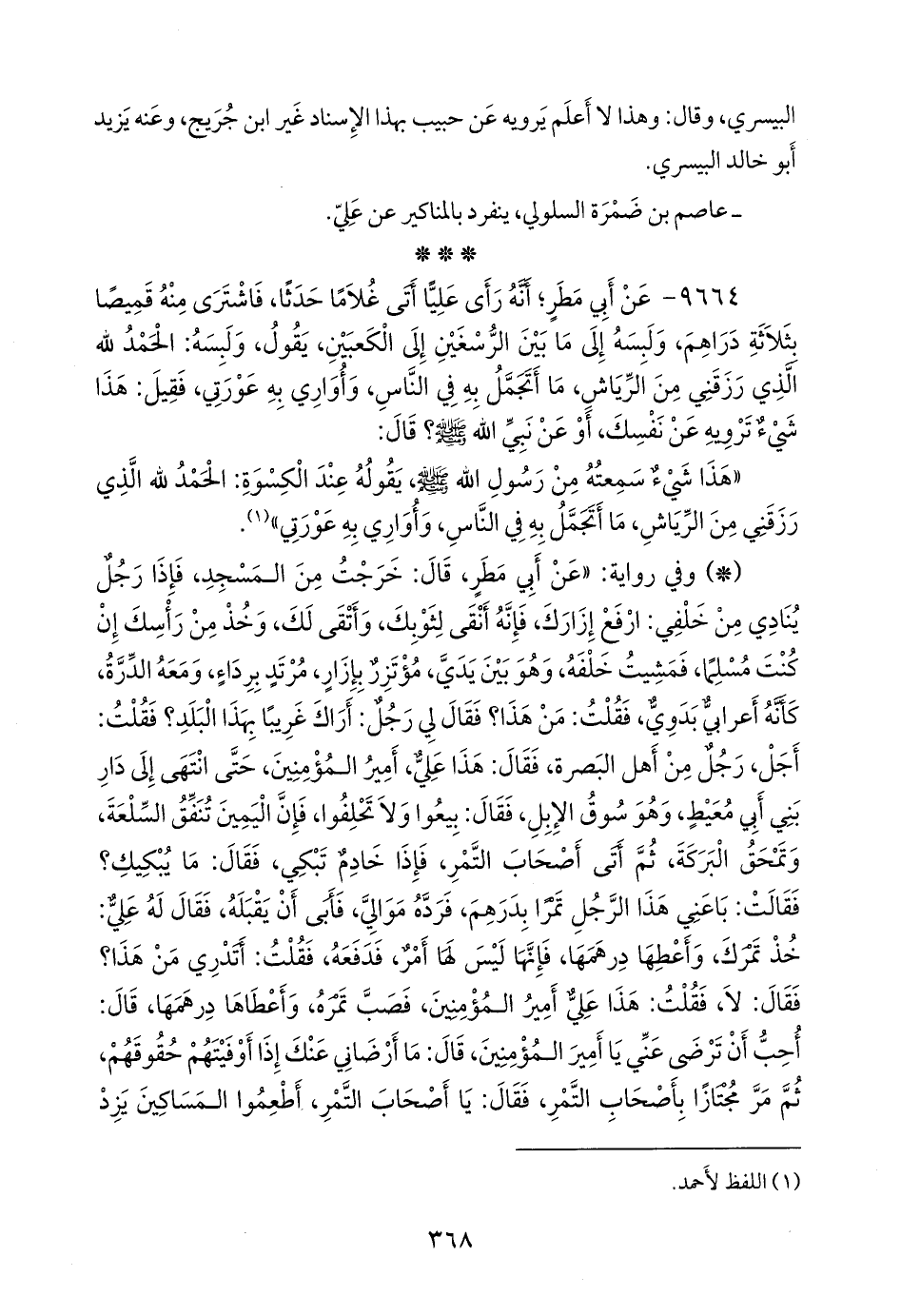 ٩٦٦٤ - عن أبي مطر؛ أنه رأى عليا أتى غلاما حدثا، فاشترى منه قميصا بثلاثة دراهم، ولبسه إلى ما بين الرسغين إلى الكعبين، يقول، ولبسه: الحمد لله الذي رزقني من الرياش، ما أتجمل به في الناس، وأواري به عورتي، فقيل: هذا شيء ترويه عن نفسك، أو عن نبي الله صَلى الله عَليه وسَلم؟ قال: