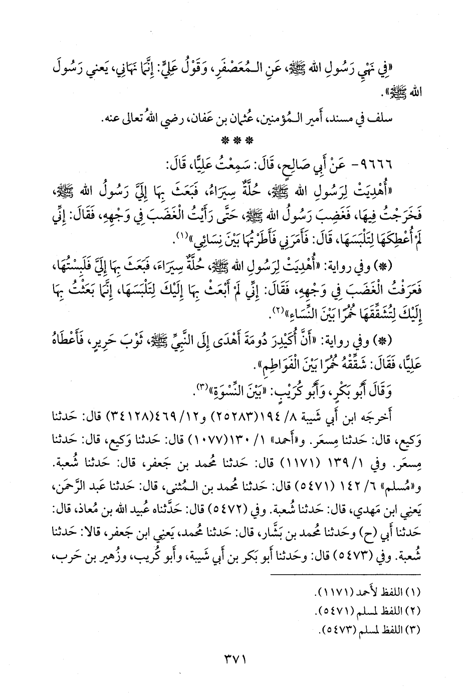 - وفي رواية: «أن أكيدر دومة أهدى إلى النبي صَلى الله عَليه وسَلم ثوب حرير، فأعطاه عليا، فقال: شققه خمرا بين الفواطم».