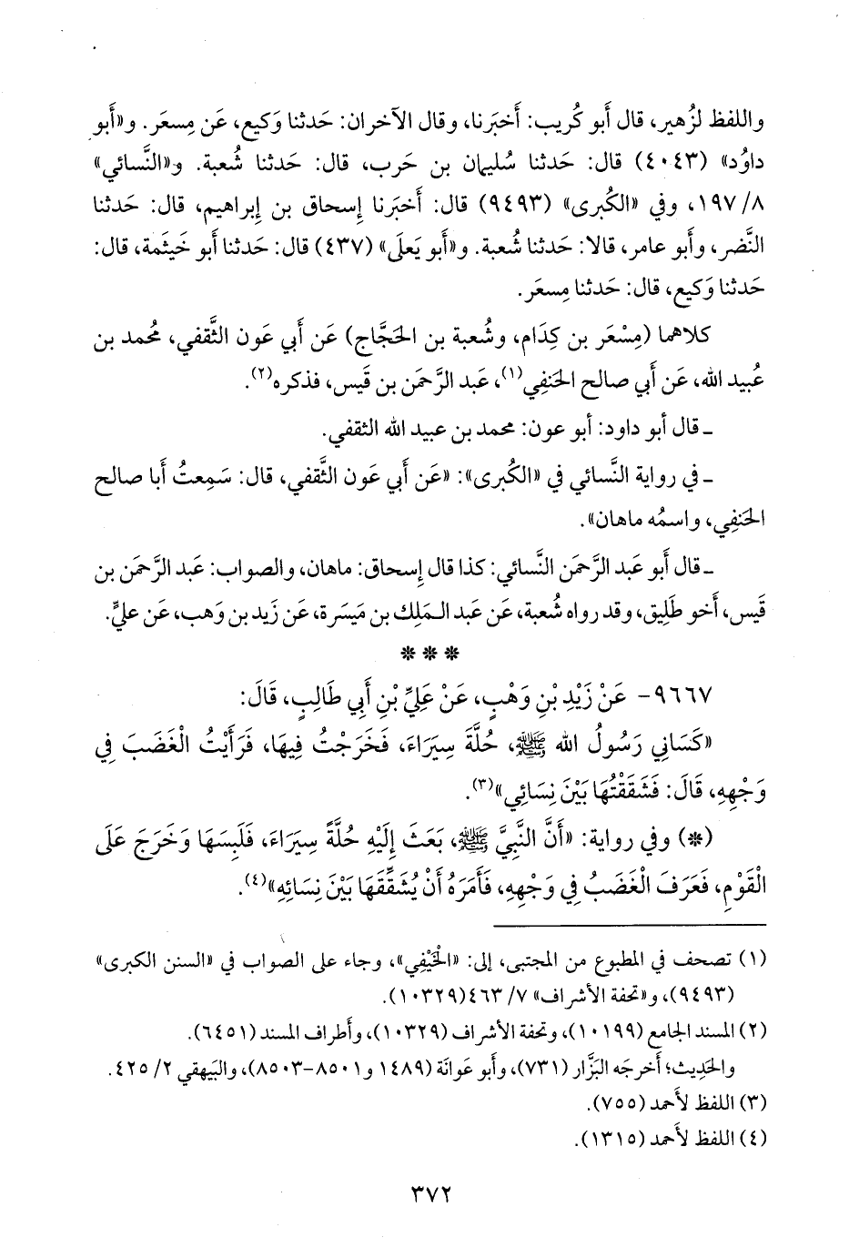 - وفي رواية: «أهدى إلي النبي صَلى الله عَليه وسَلم حلة سيراء فلبستها، فرأيت الغضب في وجهه، فشققتها بين نسائي» (¬٣).