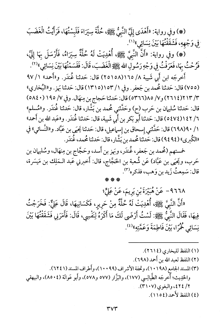 - وفي رواية: «أهدي للنبي صَلى الله عَليه وسَلم حلة من حرير، فكره أن يلبسها، وبعث بها إلي فلبستها، فرآها علي، فقال: ما أكره لنفسي شيئًا إلا أنا أكرهه لك، فخرقها بين النساء، قال: ففعلت ذلك» (¬٣).