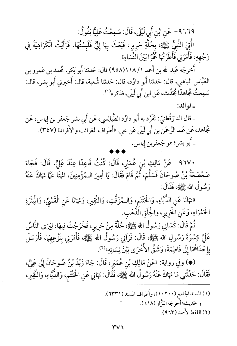 - وفي رواية: «عن مالك بن عمير، قال: جاء زيد بن صوحان إلى علي، فقال: حدثني ما نهاك عنه رسول الله صَلى الله عَليه وسَلم فقال: نهاني عن الحنتم، والدُّبَّاء، والنقير،