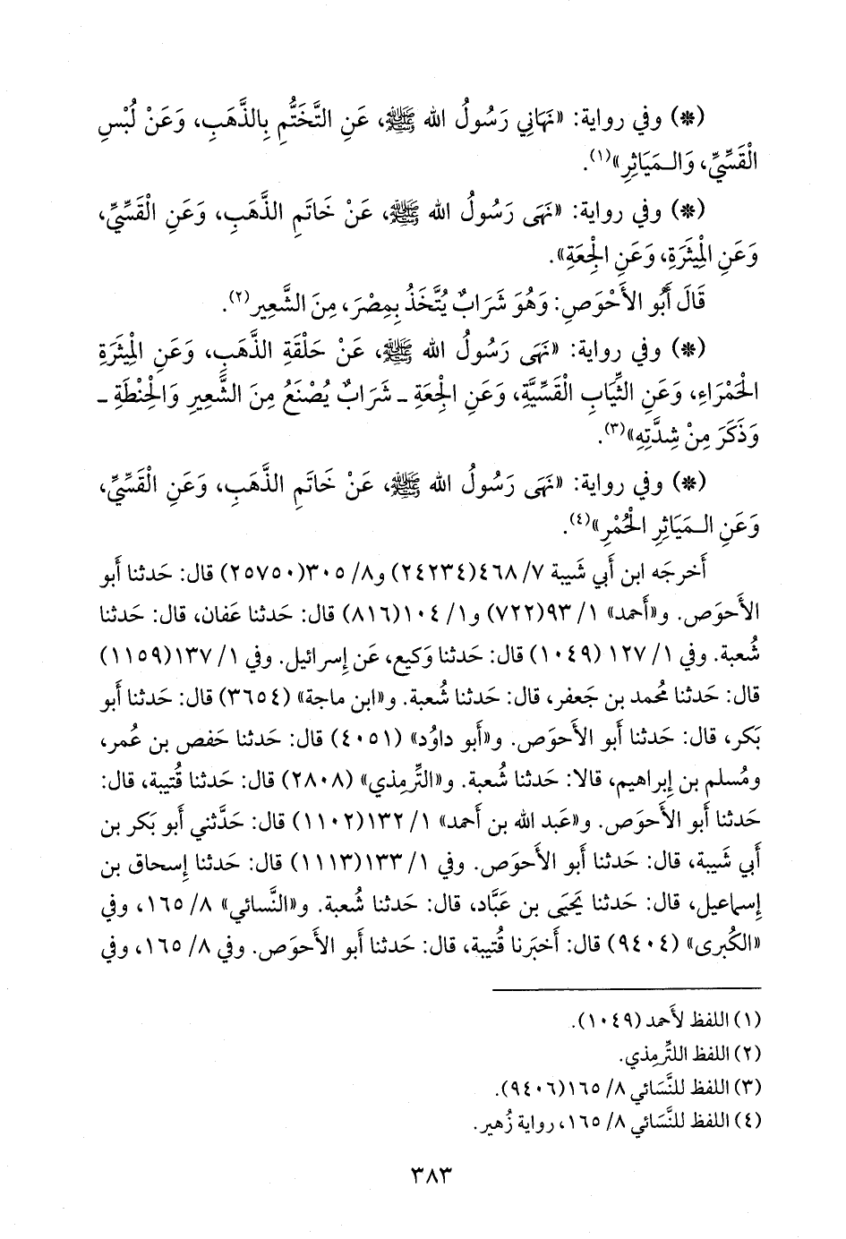 - وفي رواية: «نهى رسول الله صَلى الله عَليه وسَلم عن خاتم الذهب، وعن القسي، وعن المياثر الحمر» (¬١).
