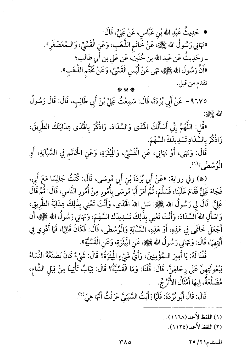 - وفي رواية: «عن أبي بردة بن أبي موسى، قال: كنت جالسا مع أبي، فجاء علي فقام علينا، فسلم، ثم أمر أبا موسى بأمور من أمور الناس، قال: ثم قال علي: قال لي رسول الله صَلى الله عَليه وسَلم: سل الله الهدى، وأنت تعني بذلك هداية الطريق، واسأل الله السداد، وأنت تعني بذلك تسديدك السهم، ونهاني رسول الله صَلى الله عَليه وسَلم أن أجعل خاتمي في هذه، أو هذه، السبابة والوسطى، قال: فكان قائما، فما أدري في أيتهما، قال: ونهاني رسول الله صَلى الله عَليه وسَلم عن الميثرة، وعن القسية».