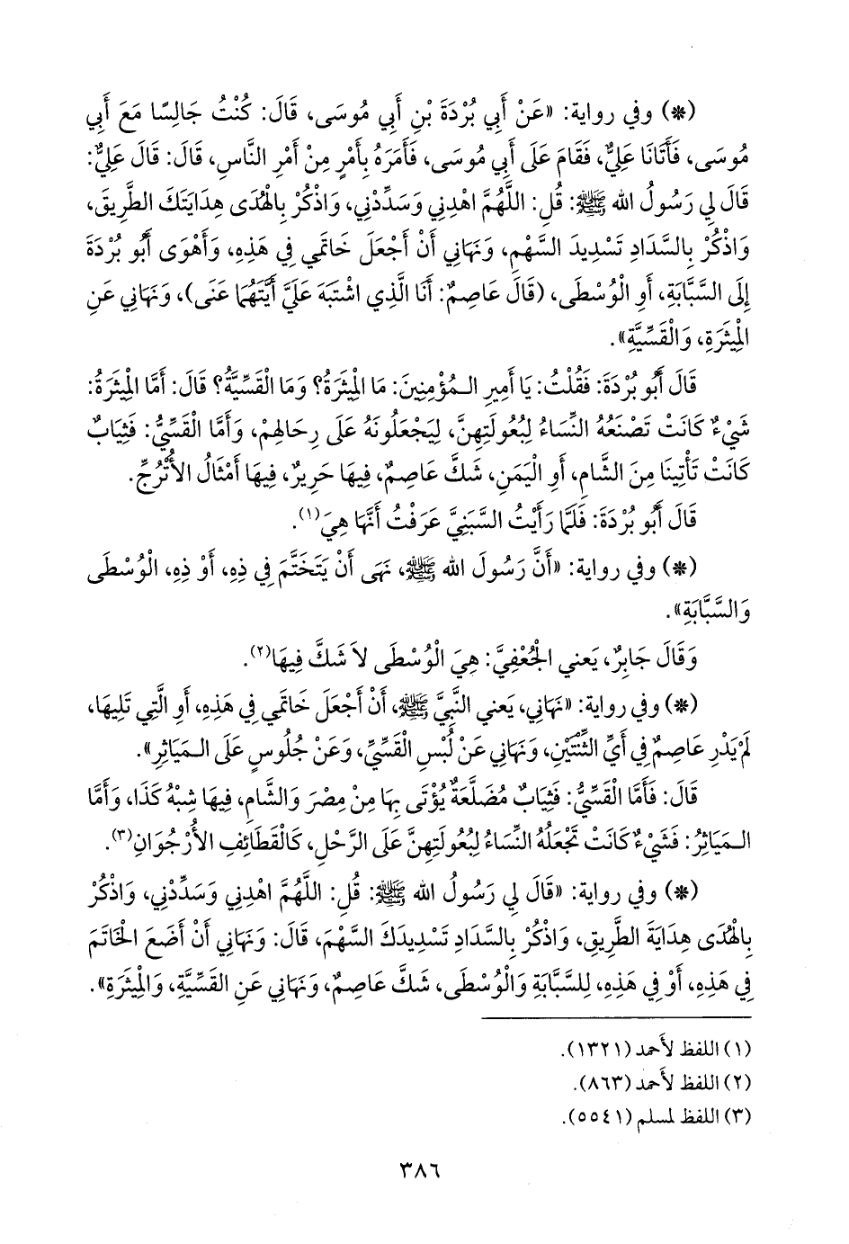 - وفي رواية: «قال لي رسول الله صَلى الله عَليه وسَلم: قل: اللهم اهدني وسددني، واذكر بالهدى هداية الطريق، واذكر بالسداد تسديدك السهم، قال: ونهاني أن أضع الخاتم في هذه، أو في هذه، للسبابة والوسطى، شك عاصم، ونهاني عن القسية، والميثرة».