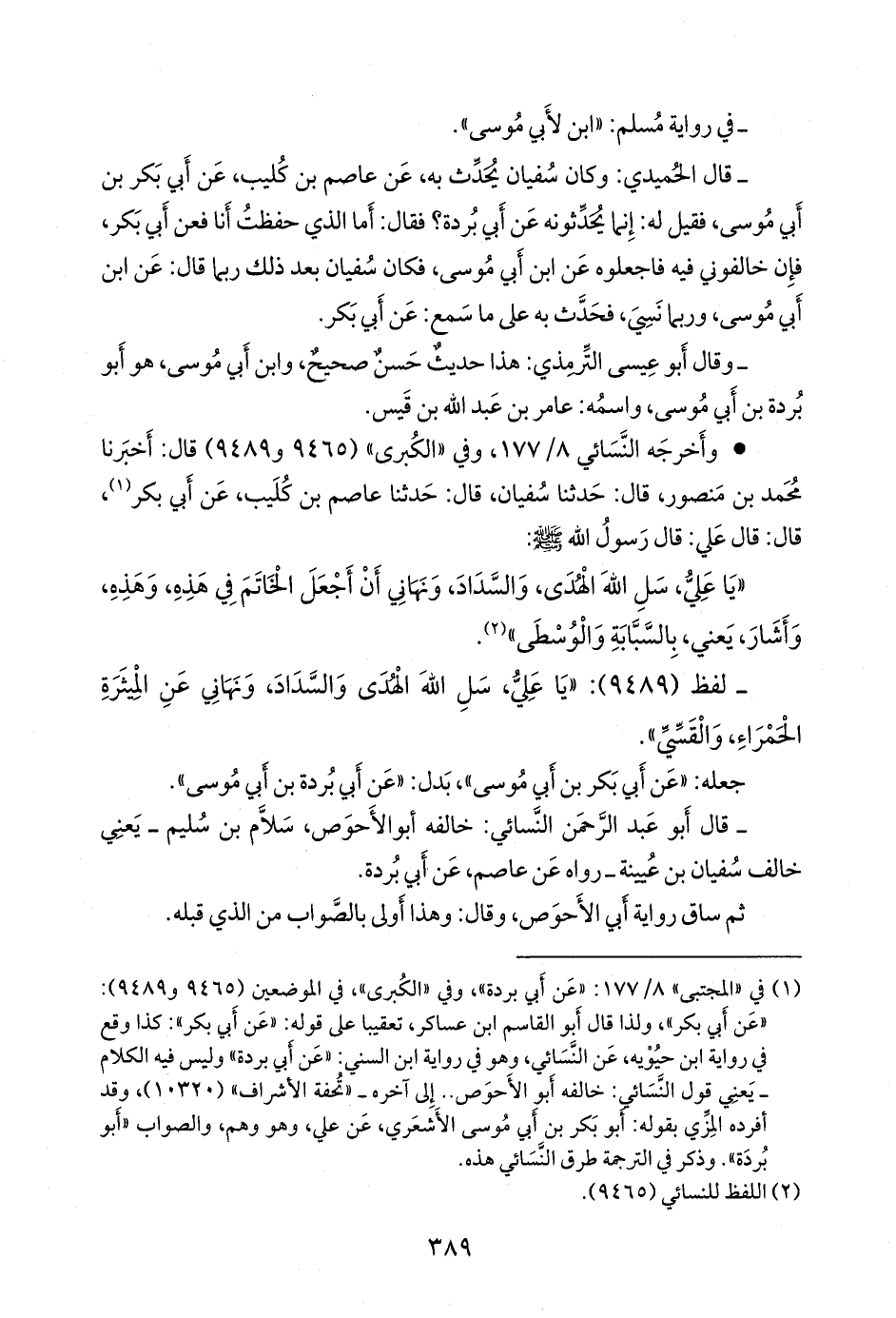 (¬١) في «المجتبى» ٨/ ١٧٧: «عن أبي بردة»، وفي «الكبرى»، في الموضعين (٩٤٦٥ و ٩٤٨٩): «عن أَبي بكر»، ولذا قال أَبو القاسم ابن عساكر، تعقيبا على قوله: «عن أَبي بكر» كذا وقع في رواية ابن حيوية، عن النَّسَائي، وهو في رواية ابن السني: «عن أبي بردة» وليس فيه الكلام، يعني قول النَّسَائي: خالفه أَبو الأحوص .. إلى آخره ـ «تحفة الأشراف» (١٠٣٢٠)، وقد أفرده المِزِّي بقوله: أَبو بكر بن أبي موسى الأشعري، عن علي، وهو وهم، والصواب «أَبو بردة». وذكر في الترجمة طرق النَّسَائي هذه.