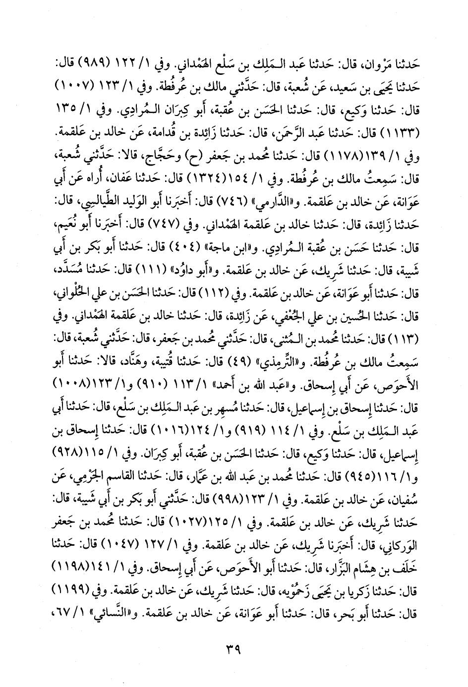 وفي «الكبرى» (٩٤) قال: أخبرنا موسى بن عبد الرَّحمَن، قال: حدثنا حسين بن علي، عن زائدة، قال: حدثنا خالد بن علقمة. وفي ١/ ٦٨، وفي «الكبرى» (٧٧ و ١٦٩) قال: أخبرنا قتيبة، قال: حدثنا أَبو عَوانة، عن خالد بن علقمة. وفي ١/ ٦٨، وفي «الكبرى» (١٠٠ و ١٦٣) قال: أخبرنا سويد بن نصر، قال: أنبأنا عبد الله، وهو ابن المبارك، عن شعبة، عن مالك بن عُرفُطة. وفي ١/ ٦٩ قال: أخبرنا عَمرو بن علي، وحميد بن مَسعَدة، عن يزيد، وهو ابن زُريع، قال: حدثني شعبة، عن مالك بن عُرفُطة. وفي «الكبرى» (٨٣) قال: أخبرنا حميد بن مَسعَدة، عن يزيد، وهو ابن زُريع، قال: حدثني شعبة، عن مالك بن عُرفُطة. وفي (١٦١) قال: أخبرنا إسحاق بن إبراهيم، قال: أخبرنا مسهر بن عبد الملك بن سلع، قال: حدثني أبي. وفي (١٦٤) قال: أخبرنا عَمرو بن علي، عن يزيد، وهو ابن زُريع، قال: حدثني شعبة، عن مالك بن عُرفُطة. و «أَبو يَعلى» (٢٨٦) قال: حدثنا زهير، وعُبيد الله القواريري، قال: حدثنا عبد الرَّحمَن بن مهدي، قال: حدثنا زائدة بن قُدَامة، عن خالد بن علقمة الهمداني. وفي (٥٠٠) قال: حدثنا خلف بن هشام، قال: حدثنا أَبو الأحوص، عن أبي إسحاق. وفي (٥٣٥) قال: حدثنا القواريري، قال: حدثنا غُندَر، قال: حدثنا شعبة، قال: سمعت مالك بن عُرفُطة. و «ابن خزيمة» (١٤٧) قال: حدثنا محمد بن أبي صفوان الثقفي، قال: حدثنا عبد الرَّحمَن، يعني ابن مهدي، قال: حدثنا زائدة بن قُدَامة، عن خالد بن علقمة الهمداني. و «ابن حِبَّان» (١٠٥٦) قال: أخبرنا الفضل بن الحُبَاب، قال: حدثنا أَبو الوليد الطيالسي، قال: حدثنا زائدة بن قُدَامة، عن خالد بن علقمة. وفي (١٠٧٩) قال: أخبرنا الحسن بن سفيان، قال: حدثنا حِبَّان بن موسى، قال: أخبرنا زائدة بن قُدَامة، قال: حدثنا خالد بن علقمة الهمداني.