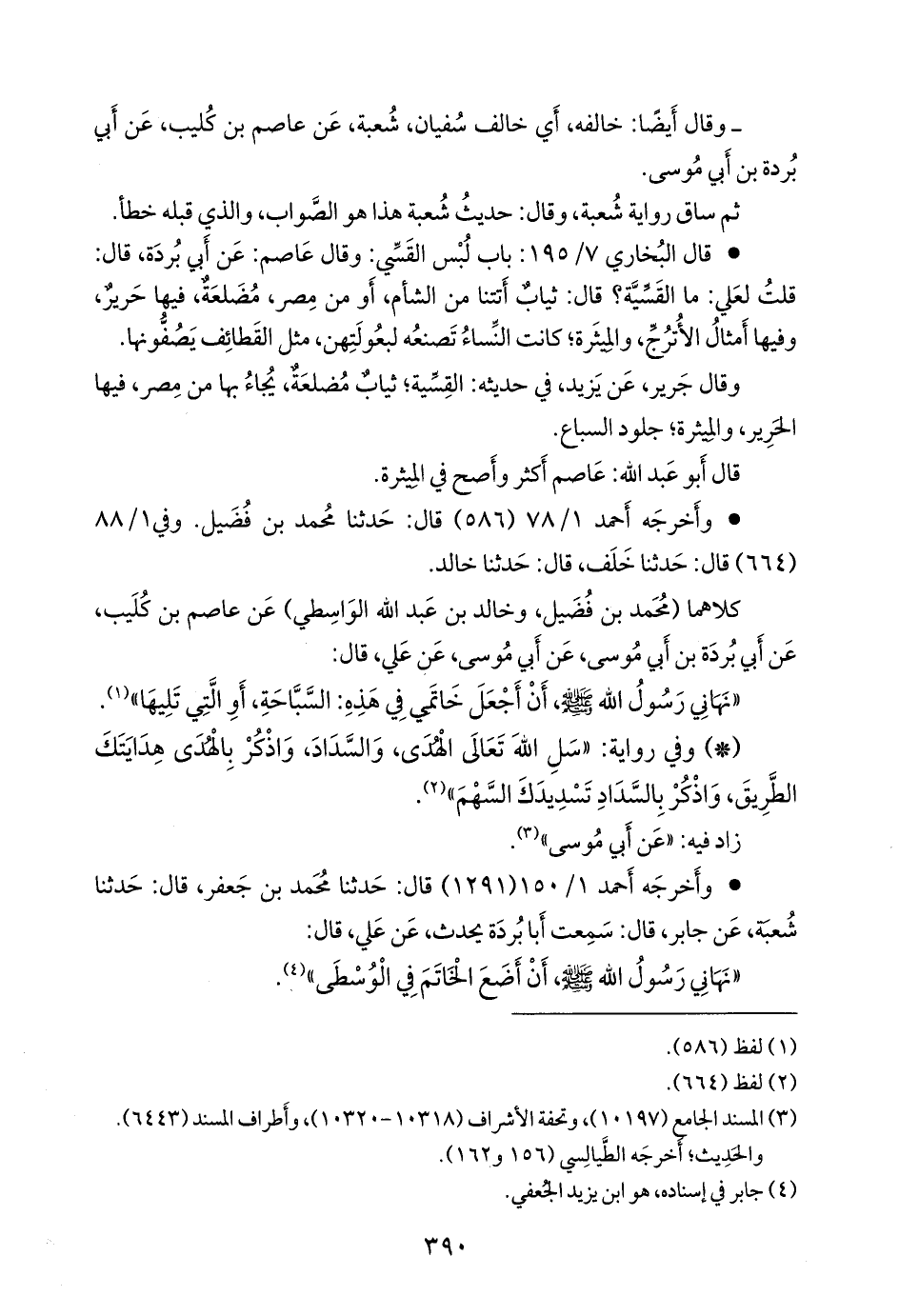 - قال البخاري ٧/ ١٥١: باب لبس القسي: وقال عاصم: عن أبي بردة، قال: قلت لعلي: ما القسية؟ قال: ثياب أتتنا من الشأم، أو من مصر، مضلعة، فيها حرير، وفيها أمثال الأترج، والميثرة؛ كانت النساء تصنعه لبعولتهن، مثل القطائف يصفونها.