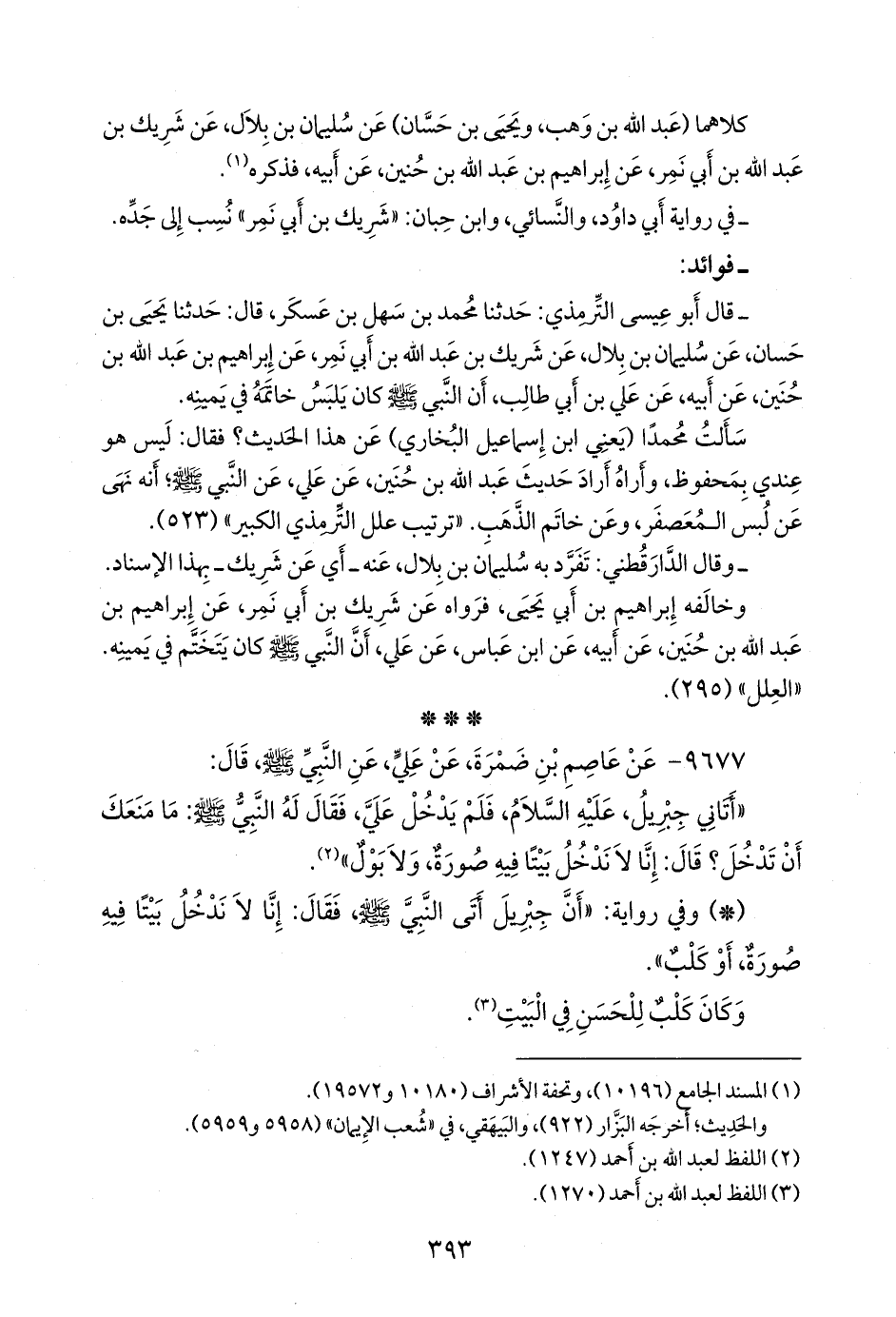- قال التِّرمِذي: حدثنا محمد بن سهل بن عسكر، قال: حدثنا يحيى بن حسان، عن سليمان بن بلال، عن شريك بن عبد الله بن أبي نَمِر، عن إبراهيم بن عبد الله بن حنين، عن أبيه، عن علي بن أبي طالب، أن النبي صَلى الله عَليه وسَلم كان يلبس خاتمه في يمينه.