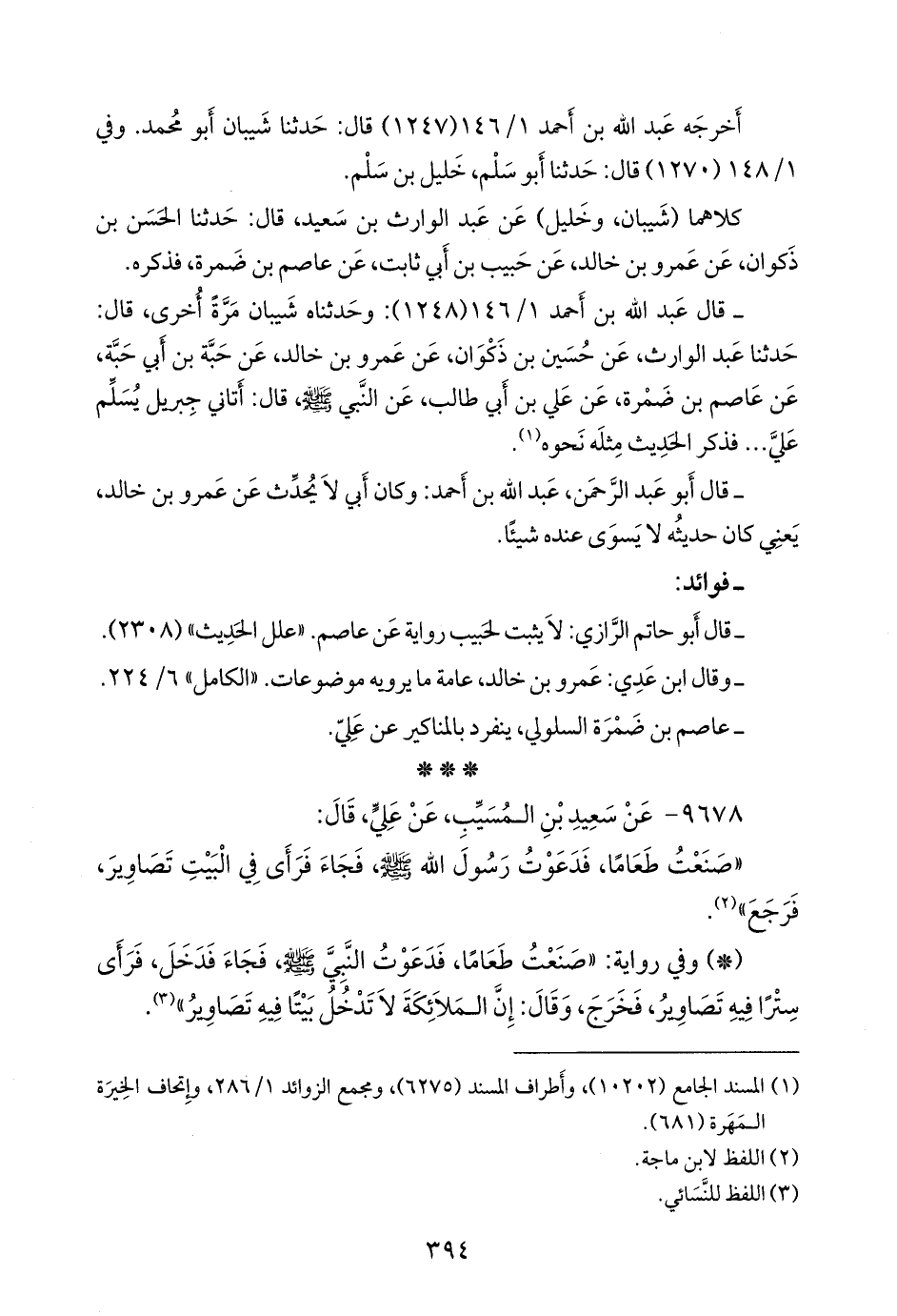 - قال عبد الله بن أحمد (١٢٤٨): وحدثناه شَيبان مرة أخرى، قال: حدثنا عبد الوارث، عن حسين بن ذكوان، عن عَمرو بن خالد، عن حبة بن أبي حبة، عن عاصم بن ضمرة، عن علي بن أبي طالب، عن النبي صَلى الله عَليه وسَلم قال: أتاني جبريل يسلم علي، فذكر الحديث مثله نحوه (¬١).