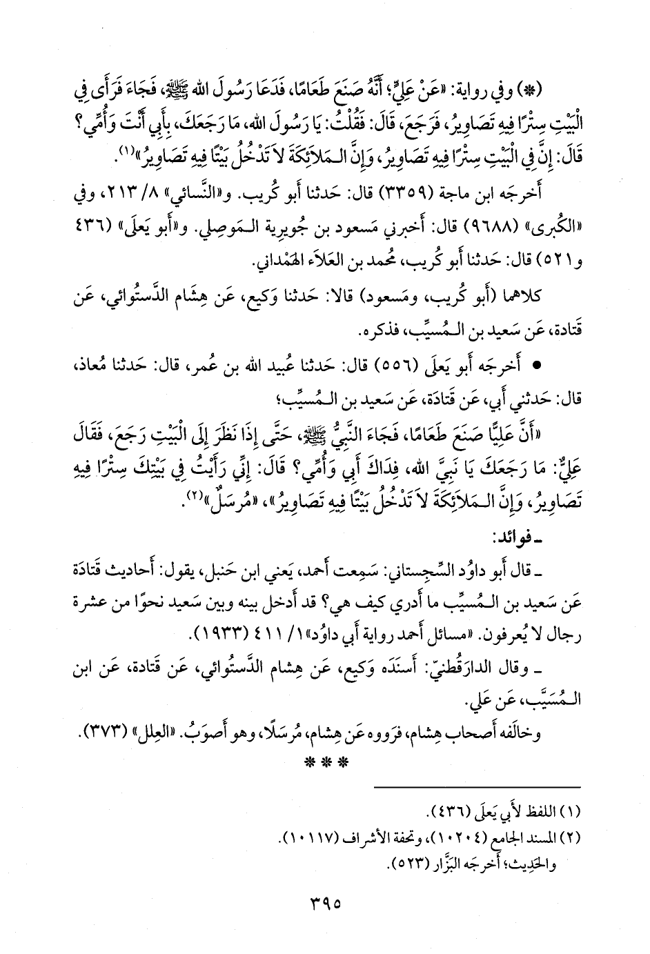 «أن عليا صنع طعاما، فجاء النبي صَلى الله عَليه وسَلم حتى إذا نظر إلى البيت رجع، فقال علي: ما رجعك يا نبي الله، فداك أبي وأمي؟ قال: إني رأيت في بيتك سترا فيه تصاوير، وإن الملائكة لا تدخل بيتا فيه تصاوير»، «مُرسَل» (¬١).