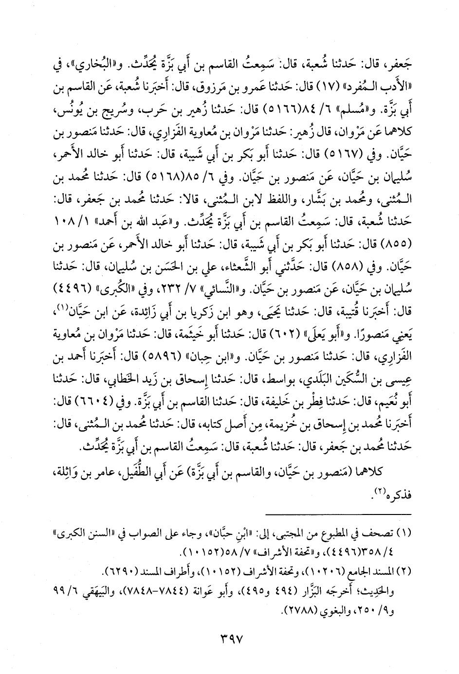 و «البخاري» في «الأدب المفرد» (١٧) قال: حدثنا عَمرو بن مرزوق، قال: أخبرنا شعبة، عن القاسم بن أبي بزة. و «مسلم» ٦/ ٨٤ (٥١٦٦) قال: حدثنا زهير بن حرب، وسريج بن يونس، كلاهما عن مروان، قال زهير: حدثنا مروان بن معاوية الفزاري، قال: حدثنا منصور بن حيان. وفي (٥١٦٧) قال: حدثنا أَبو بكر بن أبي شيبة، قال: حدثنا أَبو خالد الأحمر، سليمان بن حَيَّان، عن منصور بن حيان. وفي ٦/ ٨٥ (٥١٦٨) قال: حدثنا محمد بن المثنى، ومحمد بن بشار، واللفظ لابن المثنى، قالا: حدثنا محمد بن جعفر، قال: حدثنا شعبة، قال: سمعت القاسم بن أبي بزة يحدث. و «عبد الله بن أحمد» ١/ ١٠٨ (٨٥٥) قال: حدثنا أَبو بكر بن أبي شيبة، قال: حدثنا أَبو خالد الأحمر، عن منصور بن حيان. وفي (٨٥٨) قال: حدثني أَبو الشعثاء، علي بن الحسن بن سليمان، قال: حدثنا سليمان بن حَيَّان، عن منصور بن حيان. و «النَّسَائي» ٧/ ٢٣٢، وفي «الكبرى» (٤٤٩٦) قال: أخبرنا قتيبة، قال: حدثنا يحيى، وهو ابن زكريا بن أبي زائدة، عن ابن حيان (¬١)، يعني منصورا. و «أَبو يَعلى» (٦٠٢) قال: حدثنا أَبو خيثمة، قال: حدثنا مروان بن معاوية الفزاري، قال: حدثنا منصور بن حيان. و «ابن حِبَّان» (٥٨٩٦) قال: أخبرنا أحمد بن عيسى بن السكين البلدي، بواسط، قال: حدثنا إسحاق بن زيد الخطابي، قال: حدثنا أَبو نُعيم، قال: حدثنا فطر بن خليفة، قال: حدثنا القاسم بن أبي بزة. وفي (٦٦٠٤) قال: أخبرنا محمد بن إسحاق بن خزيمة، من أصل كتابه، قال: حدثنا محمد بن المثنى، قال: حدثنا محمد بن جعفر، قال: حدثنا شعبة، قال: سمعت القاسم بن أبي بزة يحدث.