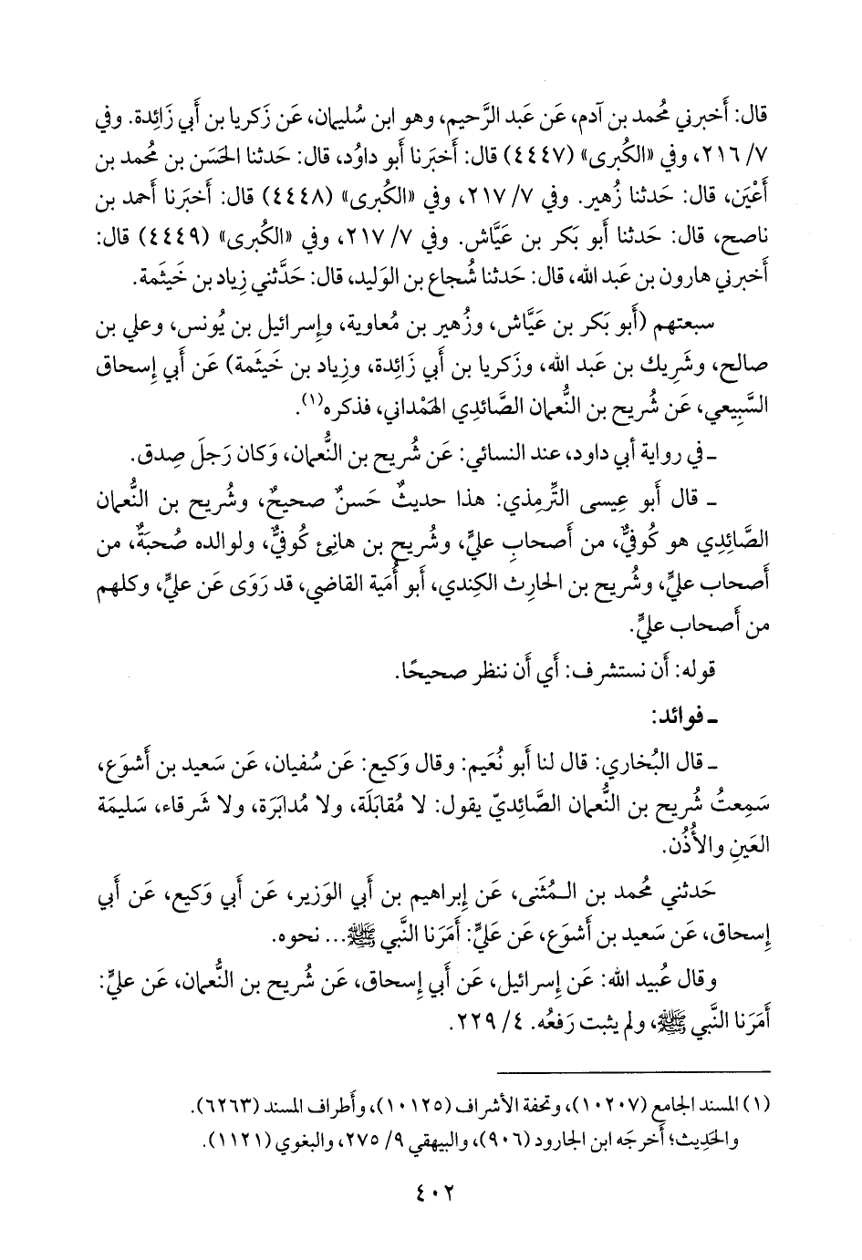 فرواه إسرائيل، وزهير، وزياد بن خيثمة، ويونس بن أبي إسحاق، وشريك، وأَبو بكر بن عياش، وعلي بن صالح، وحديج بن معاوية، وغيرهم، عن أبي إسحاق، عن شريح بن النعمان، عن علي.
