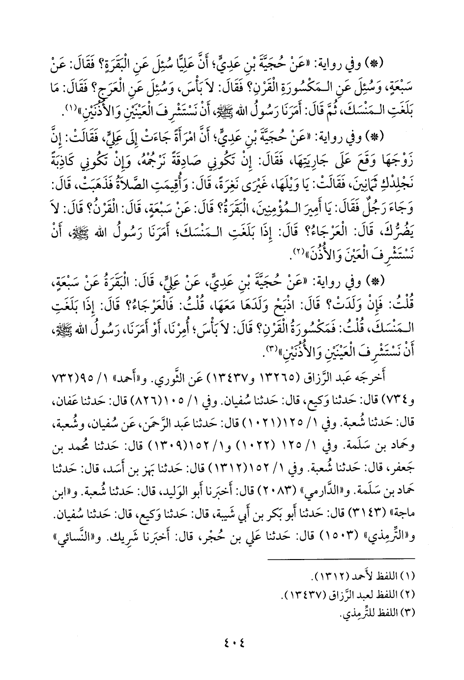 - وفي رواية: «عن حجية بن عَدي، عن علي، قال: البقرة عن سبعة، قلت: فإن ولدت؟ قال: اذبح ولدها معها، قلت: فالعرجاء؟ قال: إذا بلغت المنسك، قلت: فمكسورة القرن؟ قال: لا بأس؛ أمرنا، أو أمرنا، رسول الله صَلى الله عَليه وسَلم أن نستشرف العينين والأذنين» (¬١).