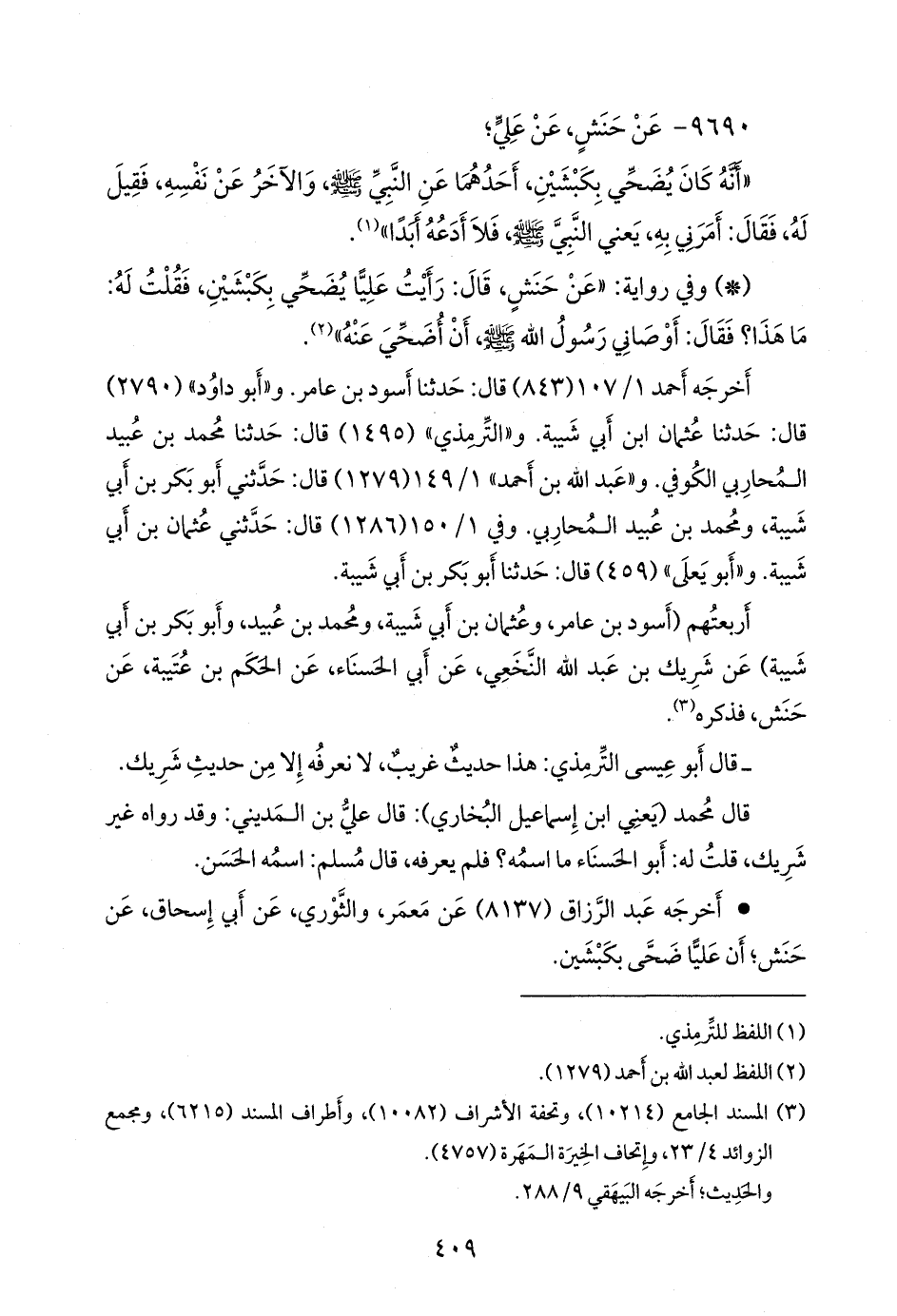 - وفي رواية: «عن حنش، قال: رأيت عليا يضحي بكبشين، فقلت له: ما هذا؟ فقال: أوصاني رسول الله صَلى الله عَليه وسَلم أن أضحي عنه» (¬٢).