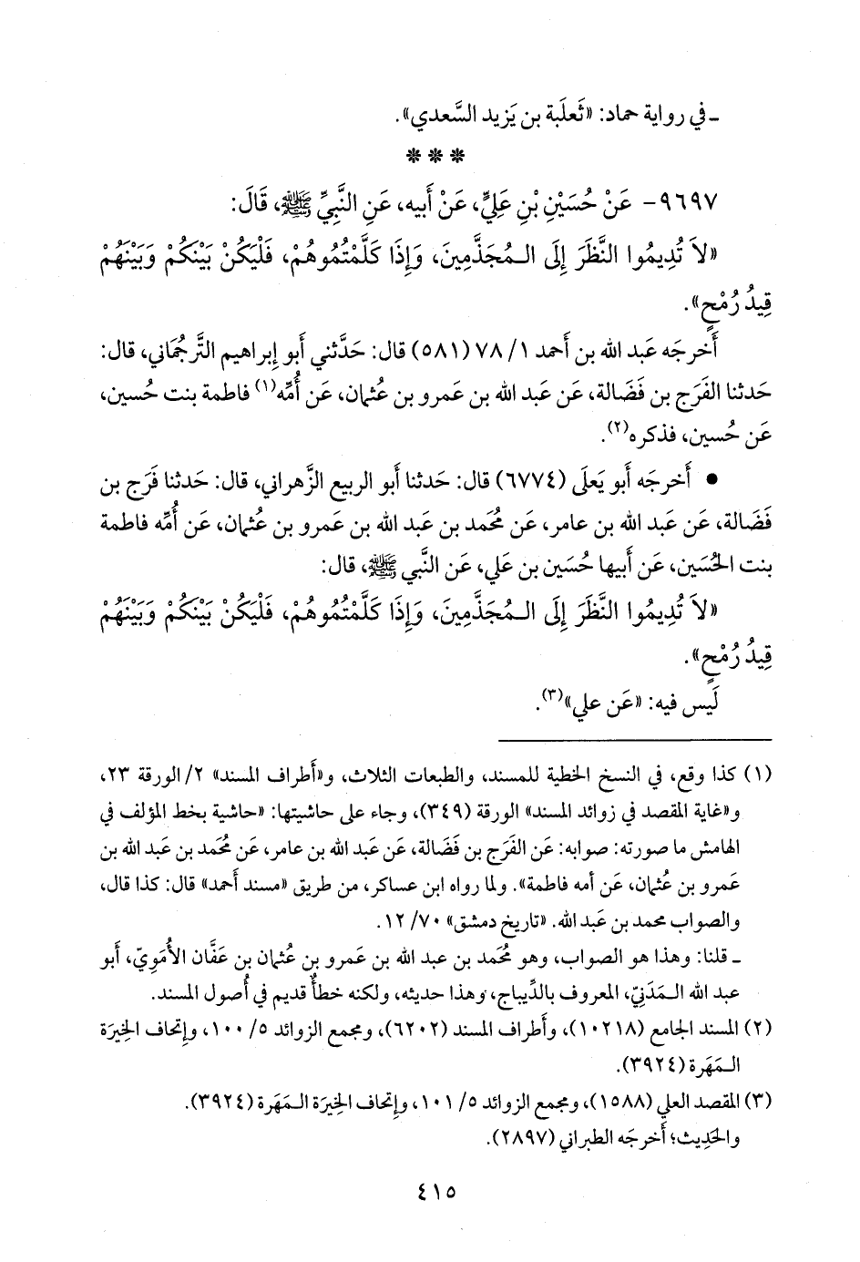 • أَخرجه أَبو يَعلى (٦٧٧٤) قال: حدثنا أَبو الربيع الزهراني، قال: حدثنا فرج بن فضالة، عن عبد الله بن عامر، عن محمد بن عبد الله بن عَمرو بن عثمان، عن أمه فاطمة بنت الحسين، عن أبيها حسين بن علي، عن النبي صَلى الله عَليه وسَلم قال:
