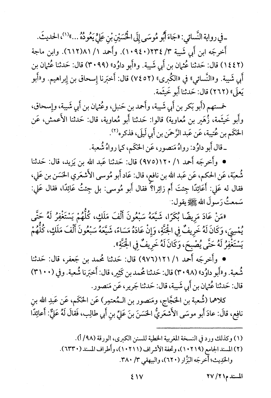 • وأخرجه أحمد (٩٧٥) قال: حدثنا عبد الله بن يزيد، قال: حدثنا شعبة، عن الحكم، عن عبد الله بن نافع، قال: عاد أَبو موسى الأشعري الحسن بن علي، فقال له علي: أعائدا جئت أم زائرا؟ فقال أَبو موسى: بل جئت عائدا، فقال علي: سمعت رسول الله صَلى الله عَليه وسَلم يقول: