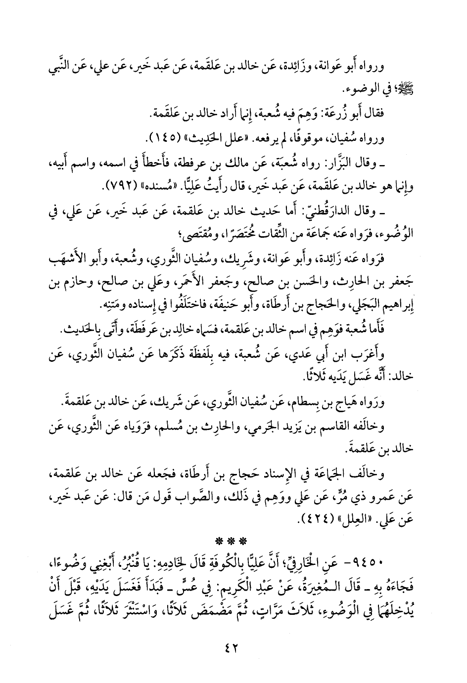 - وقال الدارَقُطني: أما حديث خالد بن علقمة، عن عَبد خَير، عن علي في الوضوء، فرواه عنه جماعة من الثقات مختصرًا ومُقتصًى؛
