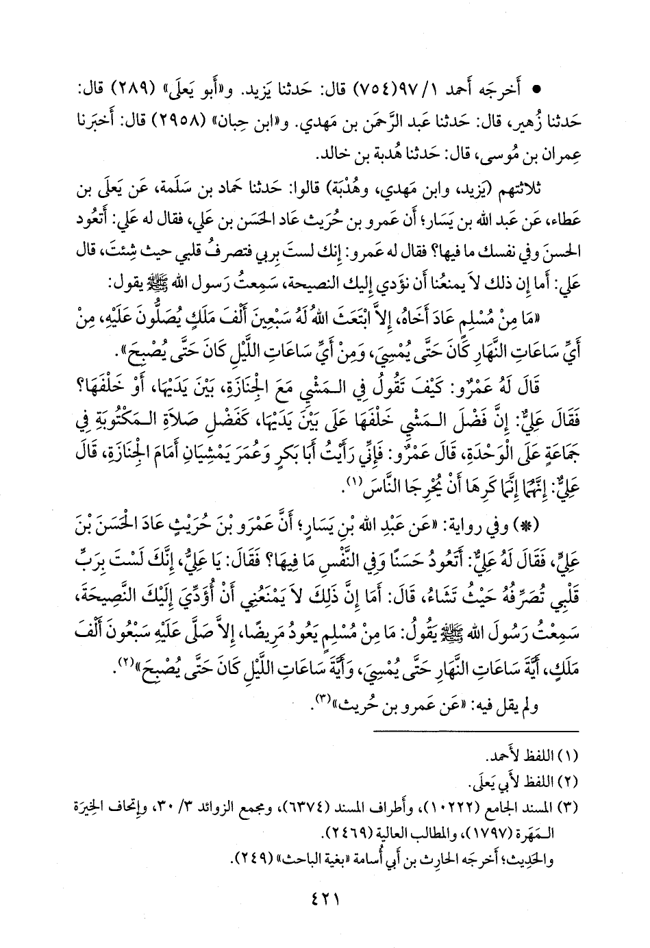 - وفي رواية: «عن عبد الله بن يسار؛ أن عَمرو بن حريث عاد الحسن بن علي، فقال له علي: أتعود حسنا وفي النفس ما فيها؟ فقال: يا علي، إنك لست برب قلبي تصرفه حيث تشاء، قال: أما إن ذلك لا يمنعني أن أؤدي إليك النصيحة، سمعت رسول الله صَلى الله عَليه وسَلم يقول: ما من مسلم يعود مريضا، إلا صلى عليه سبعون ألف ملك، أية ساعات النهار حتى يمسي، وأية ساعات الليل كان حتى يصبح».