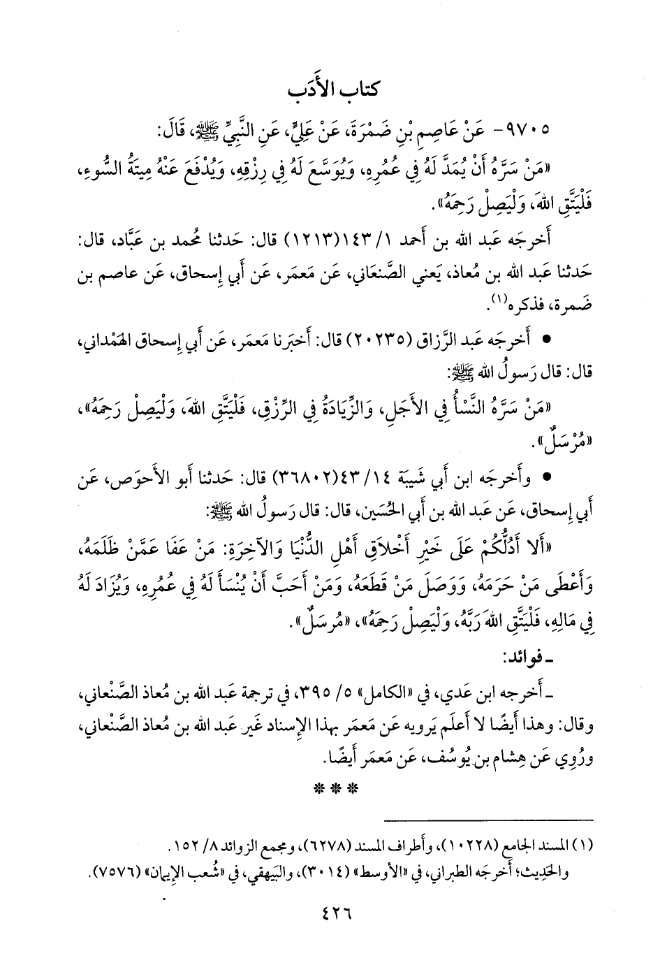 «من سره النسأ في الأجل، والزيادة في الرزق، فليتق الله، وليصل رحمه»، «مُرسَل».